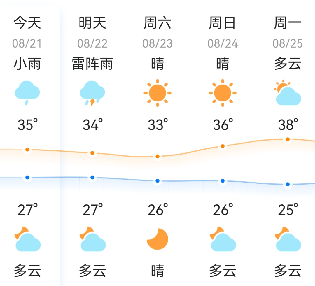 预计明天,多云间晴天,午后有阵雨或雷阵雨,27~35℃。21~22日,副高东撤,有阵雨或雷阵雨;23~27日,多云到晴天,部分时段有阵雨或雷阵雨。