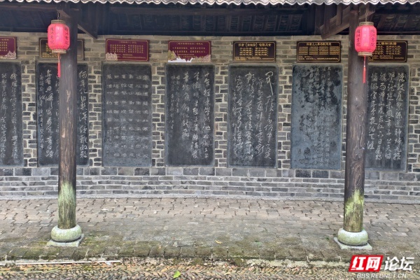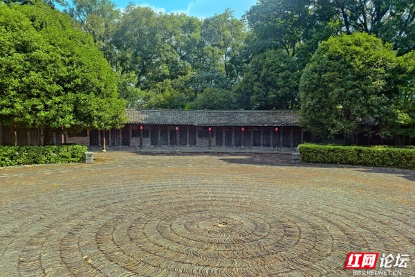 整面青砖碑墙格外吸睛,数块石碑上的字迹或苍劲、或飘逸,似在低语着历代文人心迹。开阔庭院以砖石铺就同心圆纹路,古朴又别致,四周绿树环抱,清幽得能听见风过叶梢的轻响。