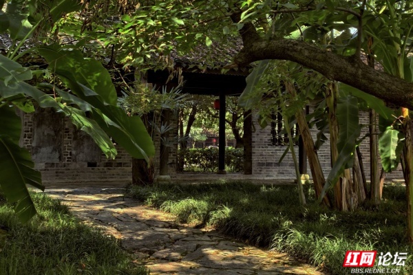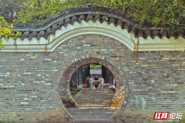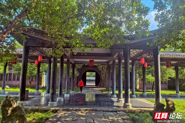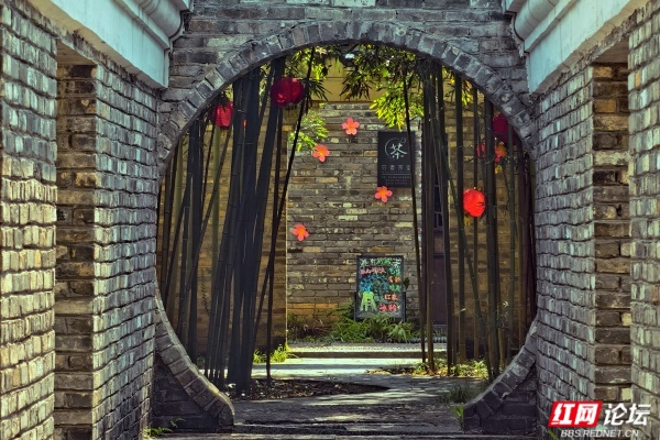 书院内的亭廊颇具韵味,黑柱红檐间悬挂的红灯笼,为古意建筑添了几分灵动,漫步其中,仿佛能触摸到昔日学子研学的热忱。沿着曲折小径前行,芭蕉曳影、修竹弄姿,砖筑的圆拱门透着江南园林的雅致。