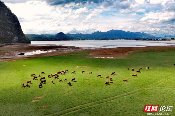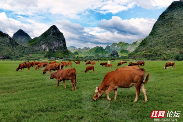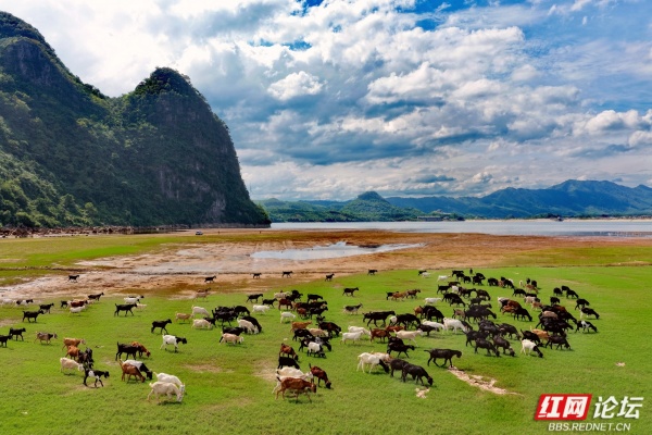 9月26日,桂林市永福县金鸡河河畔,如茵绿草铺展成辽阔的毯,成群的牛羊悠然散步,或低头啃食嫩草,或闲步晃悠,水面映着蓝天白云与层叠山峦,把草甸子衬得愈发灵动。