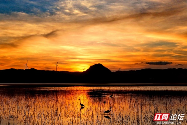 待到夕阳西下,晚霞将天际晕染成暖金,夕光泼在水面,碎成粼粼金箔,远山的风车剪着剪影,整个世界都浸在宁静壮美的氛围里,让人不由沉醉。(图/文:杨勇)