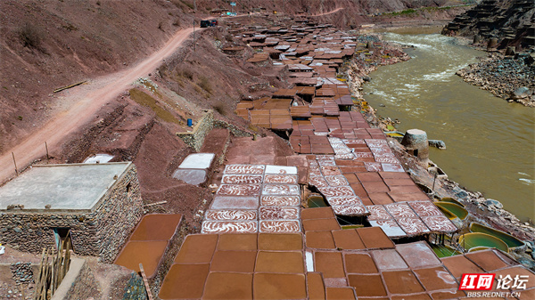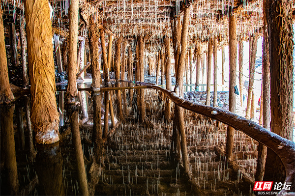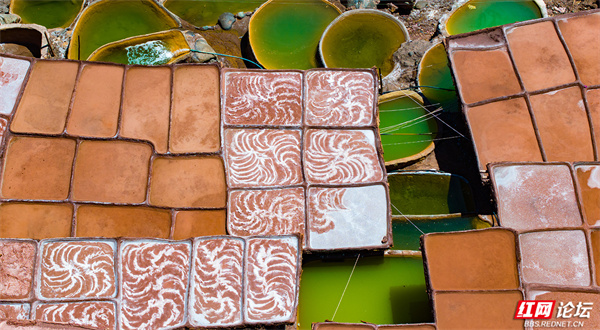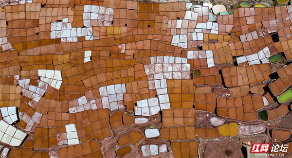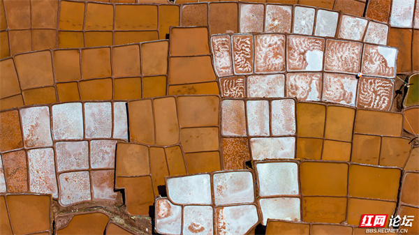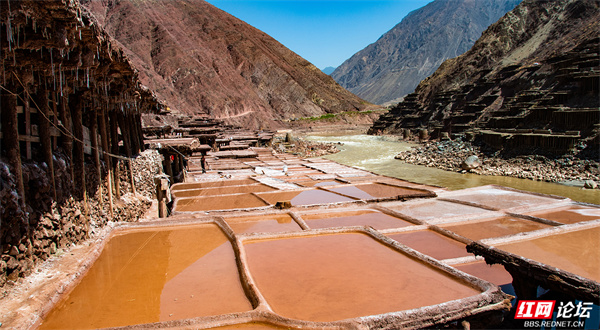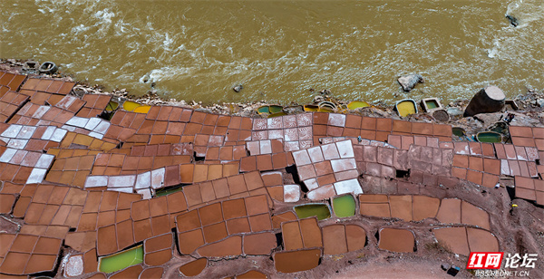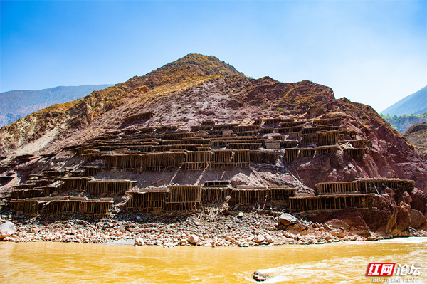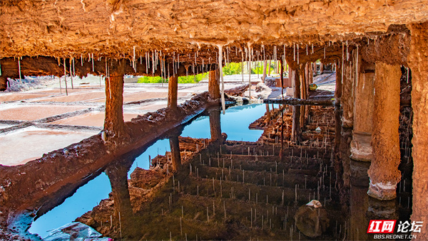 驶入澜沧江畔,红褐色高山绵延不尽,江水湍急奔腾;陡峭山坡上,悬空木架支撑的红褐色盐田密密麻麻、层层叠叠,蔚为壮观。西岸加达村地势相对平缓,江畔盐田成块连片,绵延四五百米。盐田以木架和泥土搭成方格,面积从几平米到几十平米不等,灌满的卤水或橘红或白,水下沉淀着白色结晶,走在其间,淡淡咸味扑鼻而来。盐田下方两三米高的悬空层里,碗口粗的木柱错落林立,支撑着盐田平台;粗粗细细、长长短短的钟乳盐晶垂挂如钟乳笋、似冰凌,洁白如玉,步入其间仿若闯进水晶宫殿。