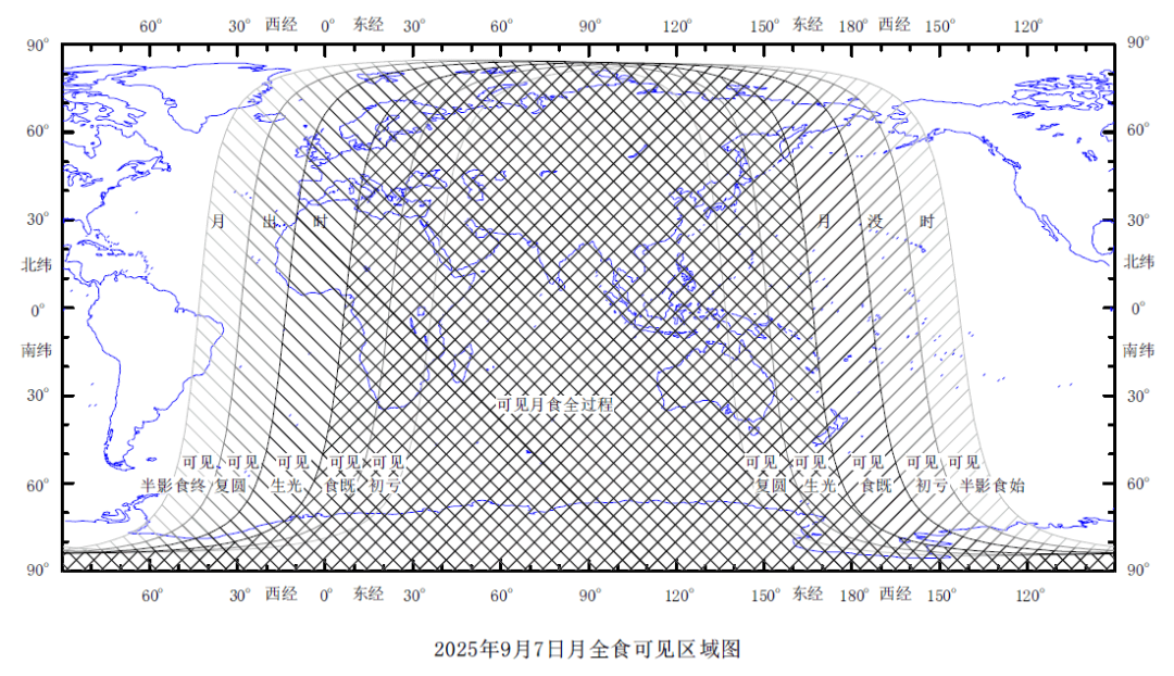 △2025年9月7日月全食见食区域图(来源:紫金山天文台)