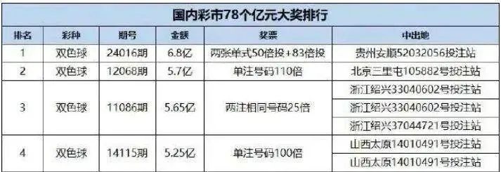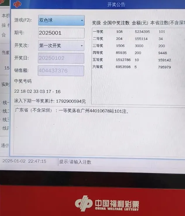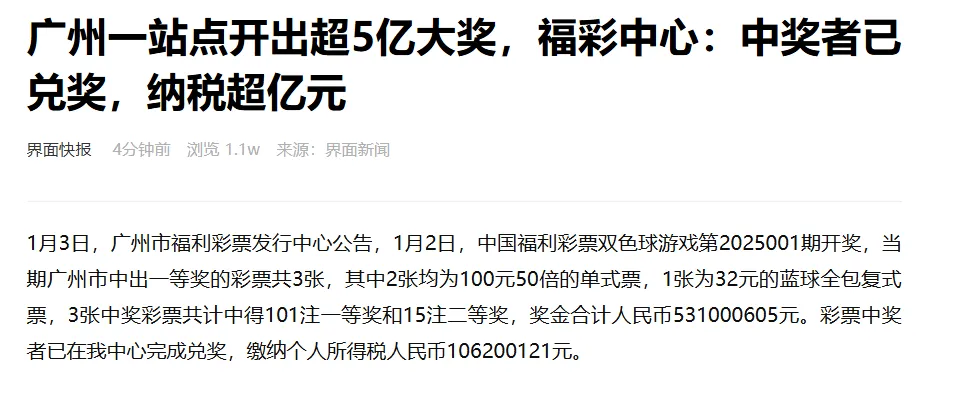 1月3日晚,广州福彩发布公告,对备受关注的“一站点独中双色球5亿巨奖”一事进行情况介绍。具体如下:2025年1月2日,中国福利彩票双色球游戏第2025001期开奖,当期广州市中出一等奖的彩票共3张,其中2张均为100元50倍的单式票,1张为32元的蓝球全包复式票,3张中奖彩票共计中得101注一等奖和15注二等奖,奖金合计人民币531000605元。彩票中奖者已完成兑奖,缴纳个人所得税人民币106200121元。此前,1月2日,福彩双色球迎来2025年首期开奖,开奖公告显示,全国中一等奖的共108注,其中广州一站点独中101注。据北京日报消息,101注一等奖的中奖站点为44010678站点,一等奖单注奖金为5234395元,该站点中奖超5亿元。这三张彩票,其中2张均为仅花100元对同一注号码50倍投注,各中得2.6亿多元。其余1张为花了32元的“6+16”的复式票(即选了6个红球,并投注了所有16个蓝色球),收获1注一等奖和15注二等奖。若这101注一等奖为同一人所购,则总奖金将达到5.31亿元!1月3日,广州市福利彩票发行中心的工作人员回应,中奖情况真实存在,“但具体是多少人中的我不清楚”。该工作人员介绍:“就全国来说,一个站点能中这个大奖的情况也是有的,投了这么多注就能开出这么多。”不过,他也提醒:“买彩票都是靠运气,不是说在这个站点买中奖概率就会高。”据媒体报道,2023年12月12日,广州南沙一站点中出22注656万多元一等奖特别奖,总奖金为1.44亿元。据信息时报消息,广州市在2013年也曾爆出过两次亿元大奖。国内彩市历年亿元巨奖排行榜也将再次刷新,并且5.31亿元将高居第四位。
