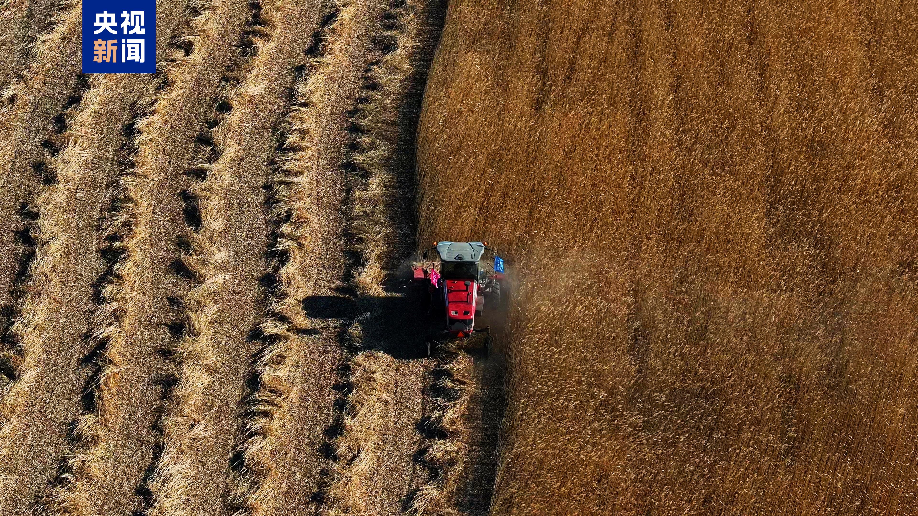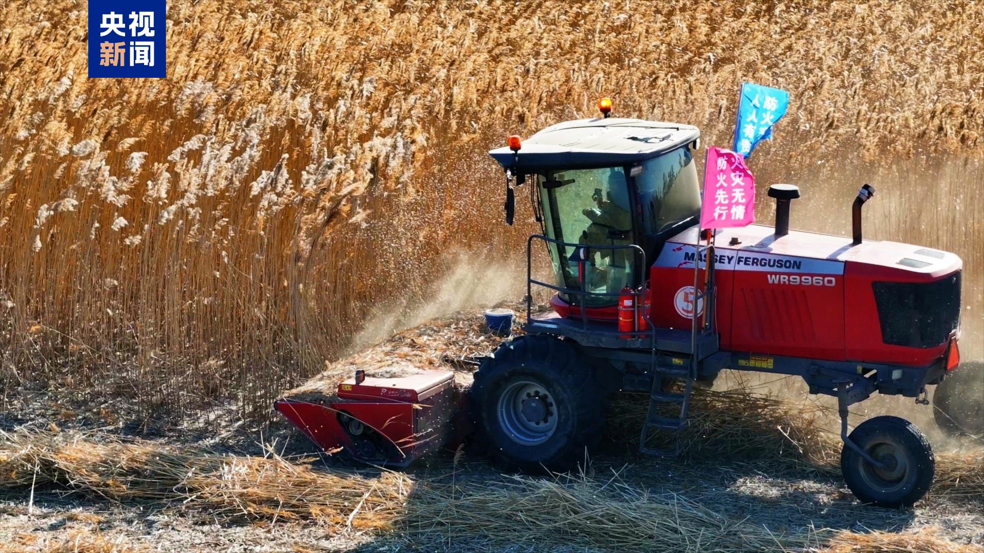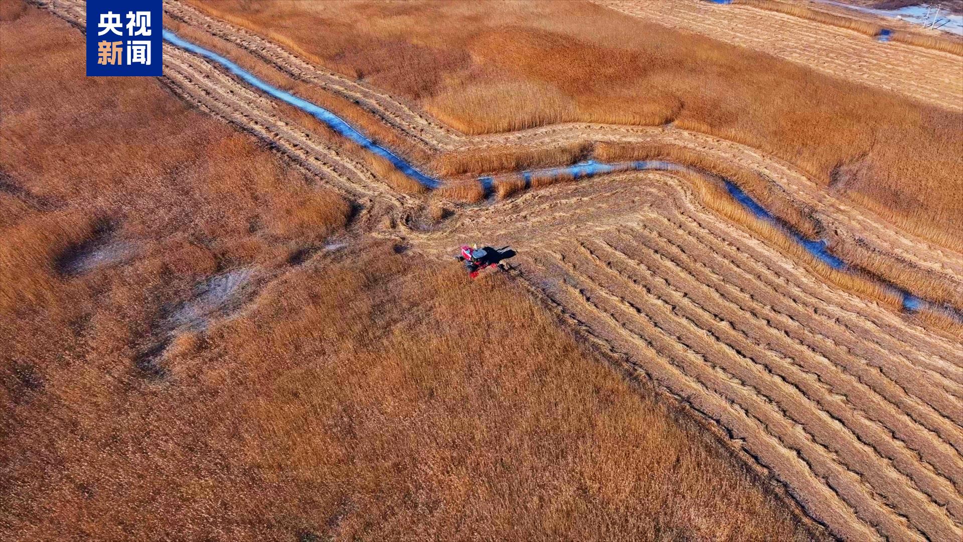 一望无际的芦苇荡中,人群聚集、芦花飞舞,各种机械穿梭在苇海中收割作业,百里苇场奏响了芦苇的丰收乐章,给严寒中的湿地增添了一份生机与活力。