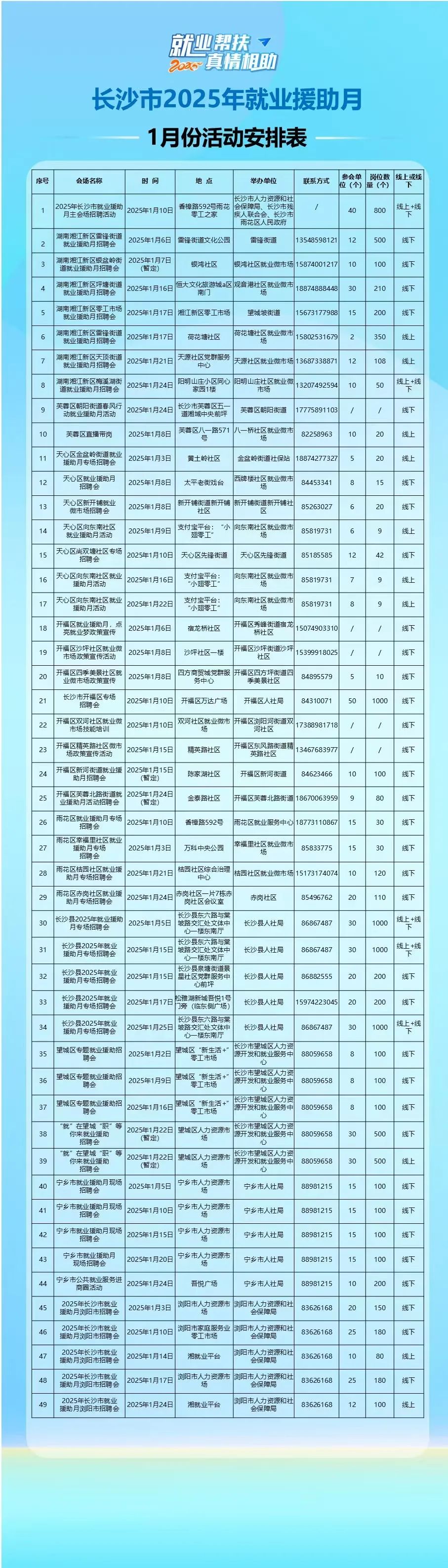 2025年1月,全市将举办49场招聘活动(其中线下37场,线上12场),累计将有700余家企业提供岗位近万个。其中,长沙市2025年就业援助月主会场招聘会活动将于1月10日举行。