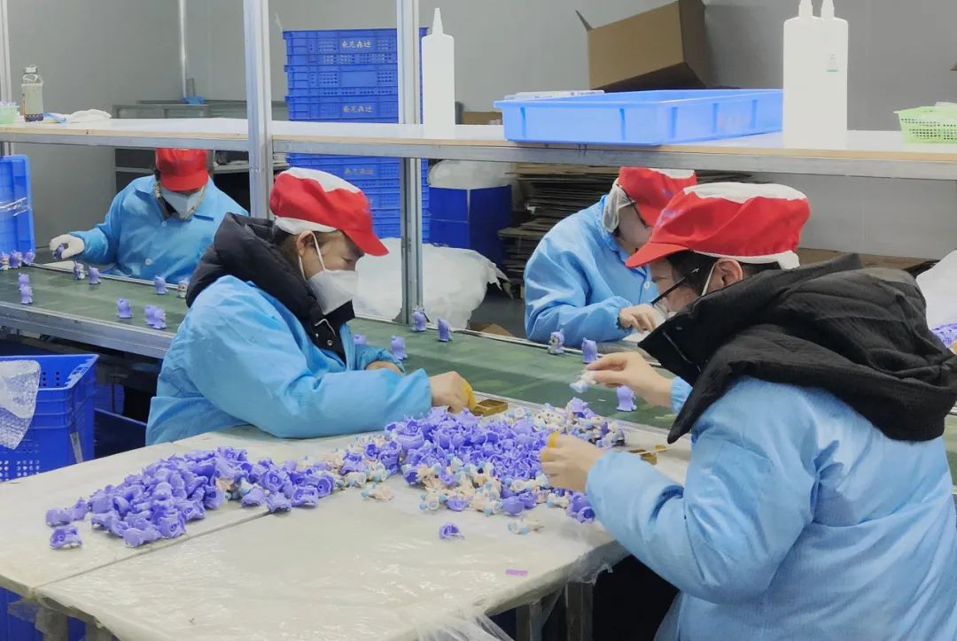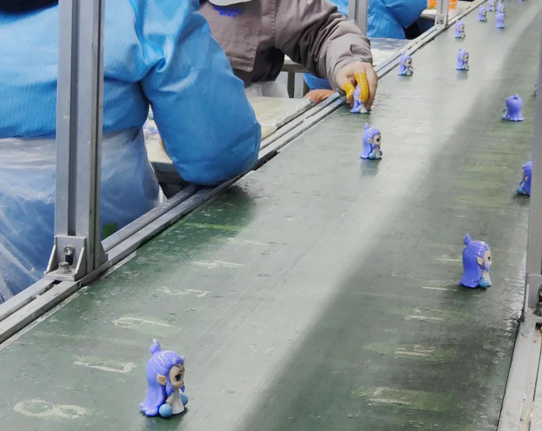 在桑尼森迪的生产车间里,工人们正有条不紊地进行模具组装、分装、打包等工序。流水线上,哪吒、敖丙、敖光等角色手办正缓缓走完所有生产流程,等待装箱出货。