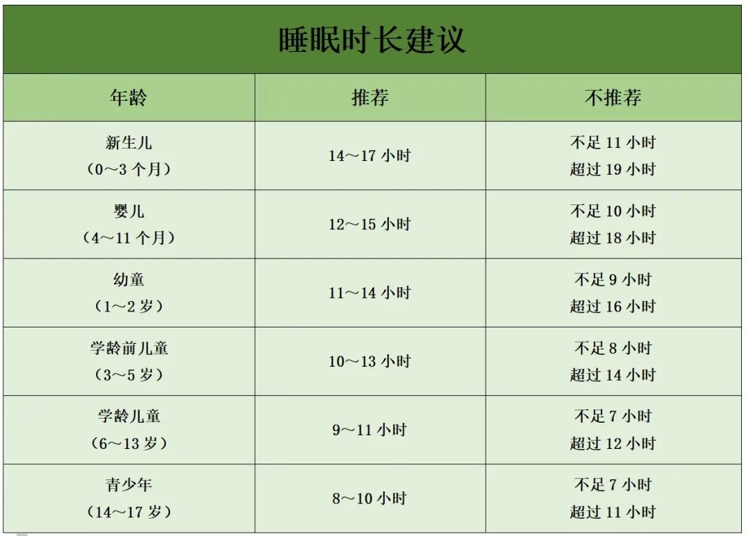 充足的睡眠也是长高的一个重要因素。睡眠时可使大脑神经、肌肉等得以松弛,解除肌体疲劳。在深睡眠后,体内生长激素分泌旺盛,充足的睡眠有利于孩子长高。睡眠时长建议: