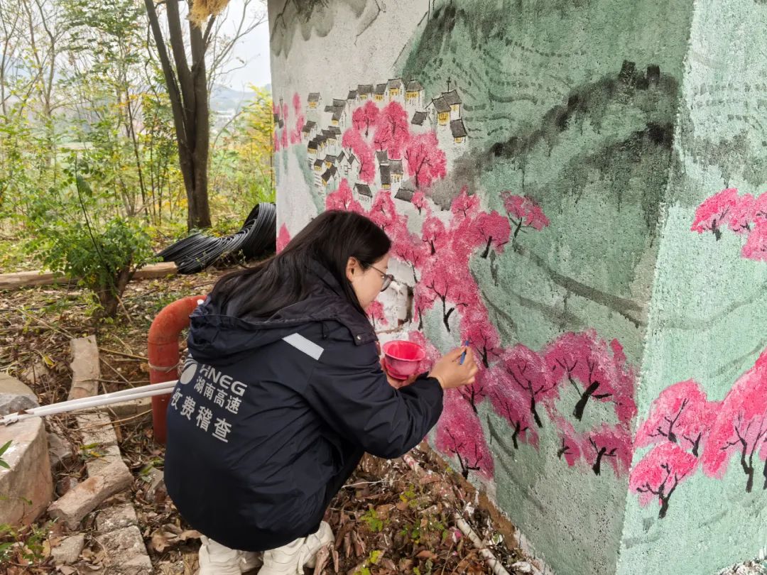 热市中心收费站是常德高速品牌站点改造的生动缩影,员工亲手打造的墙绘融入了《桃花源记》元素,墙面上桃花盛开、落英缤纷,渔人泛舟溪流,古典韵味与现代高速完美结合,既展现了常德深厚的文化底蕴,又为司乘带来了独特的视觉体验。