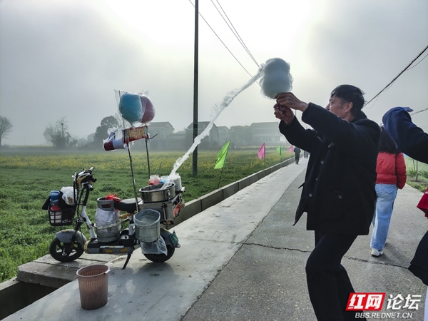 路边上,一位小商贩在制作棉花糖 。(摄影:天外来客2)