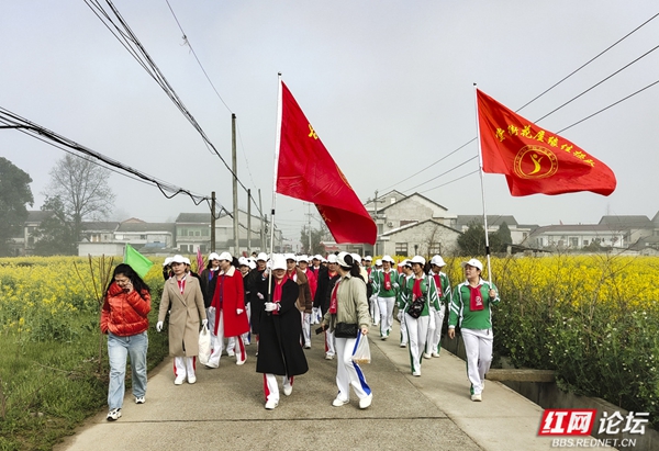 登上岸后,我们遇到了正在准备活动的古镇小蛮腰体操队。队员们整齐地排列成队,正在等待出发。一打听才知道,这天是三堂街镇举行“第三届乡村文化旅游节暨湖莲坪第六届花田巡游活动”。