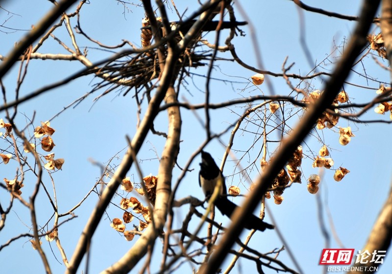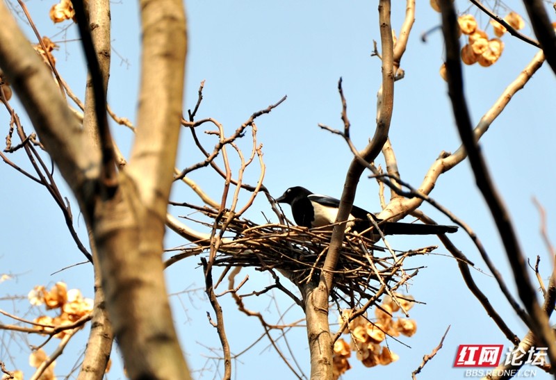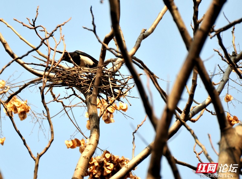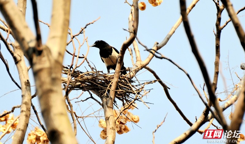 这几天,门前大树上有喜鹊在叽叽喳喳叫个不停。我看到两只喜鹊在树枝间来回飞舞,它们在寻找合适的地方筑巢。只见它们从远处衔来树枝、草叶,开始了它们的“建房”工作。(图文/吴大哥0)