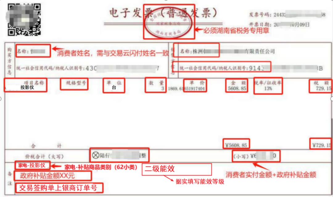 A.发票抬头为个人消费者,票面要体现商品名称、规格型号、单位、数量、单价、金额、税率、税额、价税合计等信息。备注栏须注明“家电-补贴商品品类(62小类);政府补贴金额、订单号(小UPOS签购单中“银商订单号”)”。