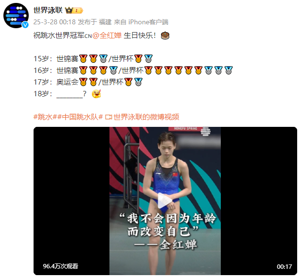 公开信息显示,全红婵,2007年3月28日出生于广东省湛江市,是中国国家跳水队的女运动员,主项为女子10米跳台。2021年,她在东京奥运会上以五跳三跳满分的成绩夺得女子10米跳台金牌,创造了历史最高得分纪录。3月27日,到北京看望国家队广东运动员的广东省二沙体育训练中心跳水项目管理中心主任凌海婵返回广州,她表示,全红婵在国家跳水队的训练一切正常,即将于本月30日出发前往墨西哥参加4月3日—6日举行的2025年世界泳联跳水世界杯瓜达拉哈拉站的比赛。赛场之外,全红婵也有着普通少女的爱好。她曾透露自己最大的心愿之一,就是可以解锁游戏时间限制,之前她每天只能玩一个小时,感觉“不够”。