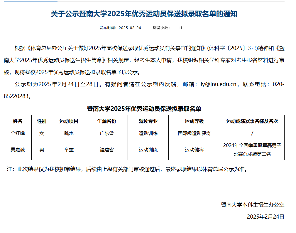2月24日,暨南大学本科招生办公室公示了2025年优秀运动员保送拟录取名单通知,跳水运动员全红婵拟就读运动训练专业,运动等级为国际级运动健将。公示期为2月24日至28日。