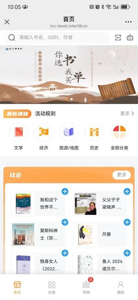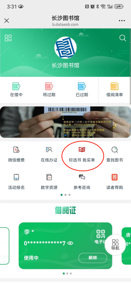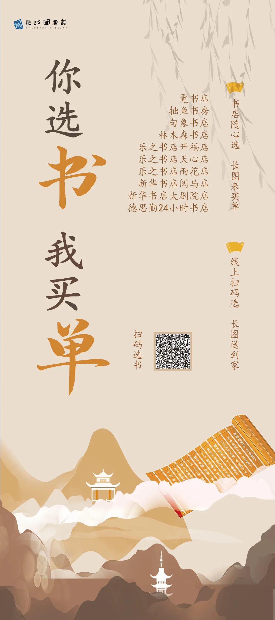 关注长沙图书馆微信公众号—微服务大厅—你选书我买单—自助选书加入购物车—提交订单坐等收货—借期满后归还至任意活动书店或长沙图书馆。
