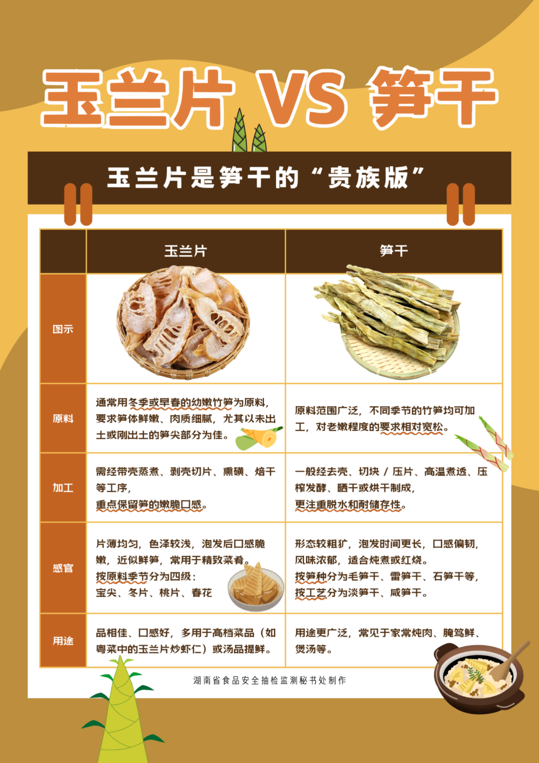 玉兰片和笋干都是以竹笋为原料加工而成的干制品,但二者在制作工艺、原料选择和成品形态上有一定区别。玉兰片通常选用冬季或早春的幼嫩竹笋(如毛竹笋)为原料,要求笋体鲜嫩、肉质细腻,尤其以未出土或刚出土的笋尖部分为佳。笋干的原料范围则更广泛,不同季节的竹笋均可加工,对老嫩程度的要求也相对宽松。