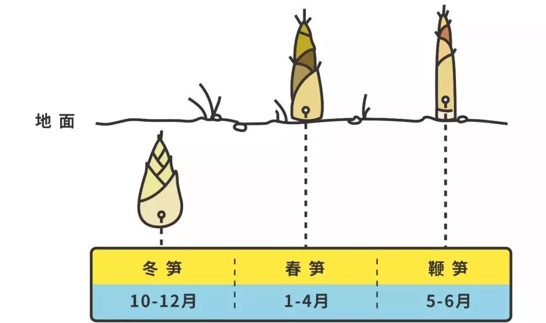 此外还有个常提到的“雷笋”,以“打雷即出笋”而得名,其实也是春笋的一种。雷笋生长周期较短,通常在立春前后就开始萌发,3~4月份产出,清明节前后上市。