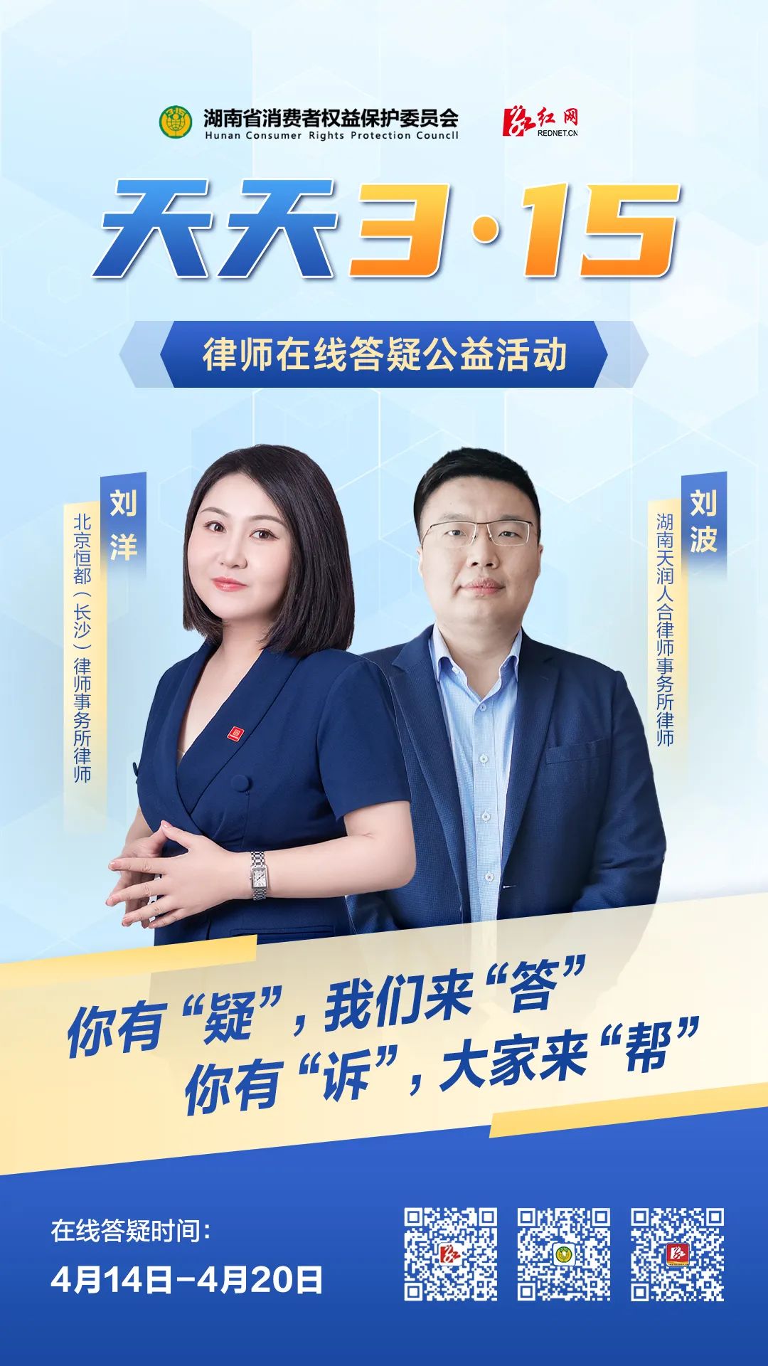 维权无忧,天天在线!红网携手湖南省消保委将“周周3·15 律师在线答疑”升级为“天天3·15 律师在线答疑”公益活动,32名专业律师轮值在线,365天响应消费者诉求,让您的合法权益天天有保障!本期由湖南省消保委第三届律师团刘洋律师(北京恒都(长沙)律师事务所)提供专业法律解答!