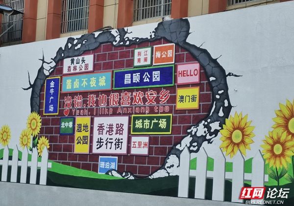 4月20日,漫步安乡城区,在老城堤东段城东小学外,原本斑驳的围墙经美术教师巧手绘就,一幅生动别致的文化长廊徐徐展开——金色向日葵向阳绽放,潺陵古景诗意流淌,配以"做文明安乡人"的温馨提示,艺术与文明的交响在这面老墙上奏响。