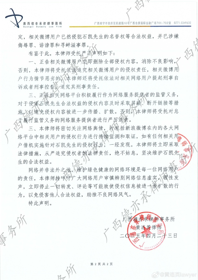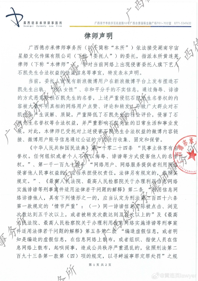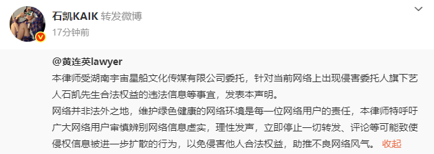 4月23日,男艺人@石凯KAIK 转发律师公告,其中提到:当前,委托人发现有用户捏造石凯先生出轨、PUA女性、非和平分手不实信息。并表示:网络并非法外之地,维护绿色健康的网络环境是每一位网络用户的责任,本律师特呼吁广大网络用户审慎辨别网络信息虚实,理性发声,立即停止一切转发、评论等可能致使侵权信息被进一步扩散的行为,以免侵害他人合法权益,助推不良网络风气。