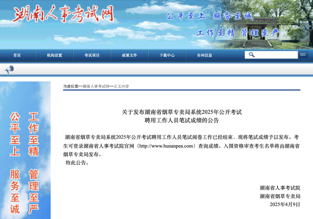 湖南省烟草专卖局系统2025年公开考试聘用工作人员笔试阅卷工作已经结束,现将笔试成绩予以发布。考生可登录湖南省人事考试院官网(http://www.hunanpea.com)查询成绩。入围资格审查考生名单将由湖南省烟草专卖局发布。