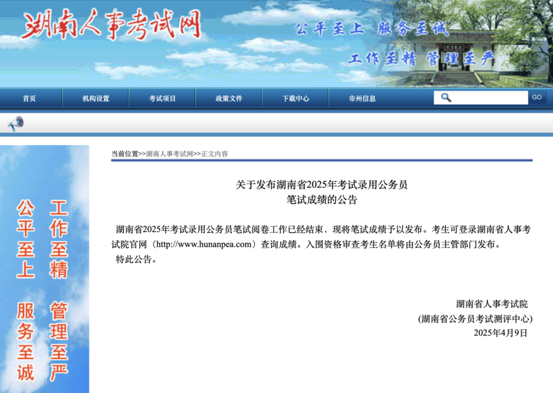 湖南省2025年考试录用公务员笔试阅卷工作已经结束,现将笔试成绩予以发布。考生可登录湖南省人事考试院官网(http://www.hunanpea.com)查询成绩。入围资格审查考生名单将由公务员主管部门发布。
