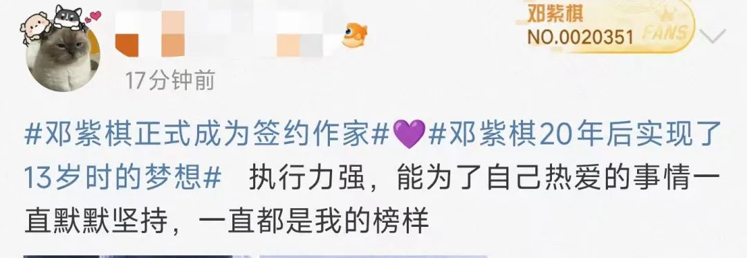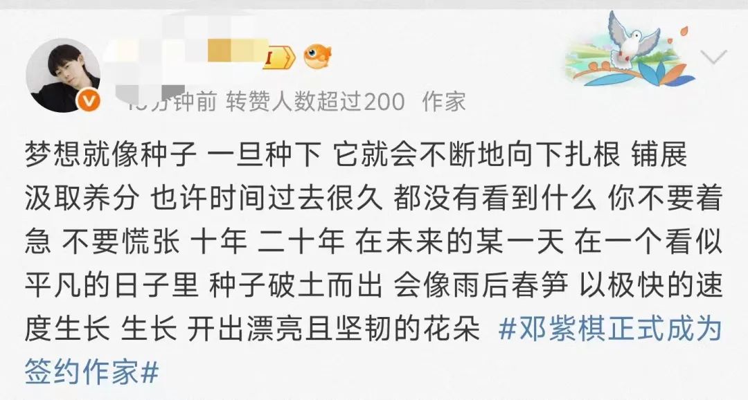 今年1月12日,邓紫棋曾在直播中表示,小说已经写了11万字,透露正在写的小说是她之前发了一张专辑《启示录》里面的故事,写着写着,已经发展到了她开始研究量子力学,还有宇宙起源、AI等各个层面的东西,所以如果真的要把这个小说给写完的话,她的脑子得非常非常清晰,得有时间坐那里啥事不干,一心一意地去写作。不只是把专辑《启示录》里14集的音乐连续剧写成文字,有太多新的东西,需要时间打磨,小说写完后准备找出版社出版。邓紫棋本名邓诗颖,1991年8月16日出生于上海市,华语流行乐女歌手、词曲作者、音乐制作人。2008年,发行个人首张EP《G.E.M.》。2011年,成为首位登上香港红馆开唱的90后女歌手。2013年,凭借专辑《Xposed》提名第24届台湾金曲奖“最佳国语女歌手奖”,并获得IFPI香港唱片销量大奖“全年最高销量女歌手奖”。2014年,参加音乐节目《我是歌手第二季》并获得总决赛亚军;2015年,登上央视春晚弹唱歌曲《多远都要在一起》。2016年,入选福布斯《全球30岁以下最具潜力音乐人》榜单。2017年,入选StubHub平台“全球十大巡演票房畅销女歌手”,并获得Mnet亚洲音乐大奖“最佳亚洲艺人奖”。2021年,其歌曲《光年之外》的MV被吉尼斯世界纪录认证为“YouTube上观看次数最多的中文音乐视频”。2022年发行音乐专辑《启示录》。2023年,其YouTube频道累计观看次数突破20亿次;同年,举行邓紫棋“I AM GLORIA”世界巡回演唱会。2025年4月2日,成为签约作家。网友:从原创歌手到全创作歌手