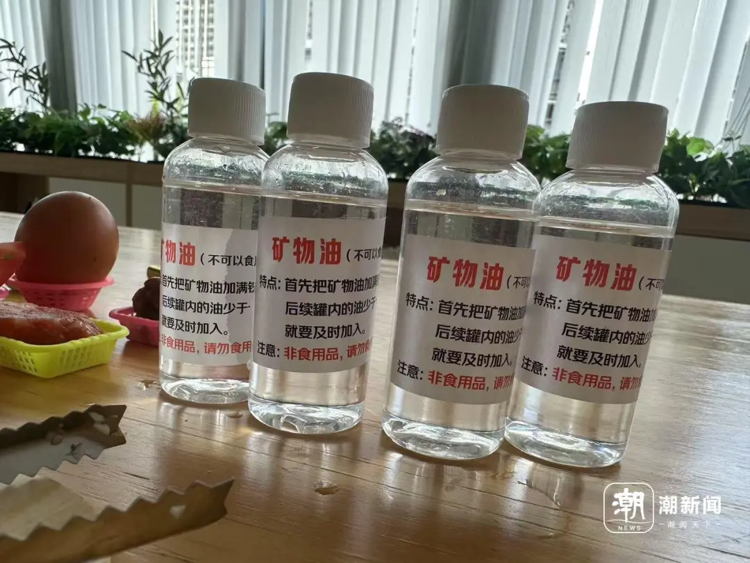 而锅下的燃烧罐,使用的是商家赠送的“矿物油”进行引燃——一小罐“矿物油”约100毫升,需手动倒入“灶台”空罐中。潮新闻记者亲测发现,罐口直径偏小,在倾倒时,这些“矿物油”容易外溢在瓶身外沿,甚至流淌到瓶身外。