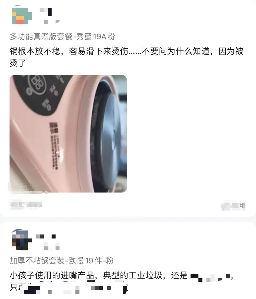 在某产品近8000多条评价中,有近千条中差评,“产品存在严重设计缺陷,有很大安全隐患”“锅和炉子不匹配,很容易掉下来,孩子容易烫伤”“就煎了个鸡蛋,锅底变形了”……