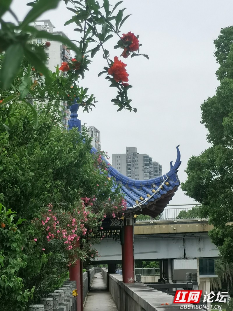且看那古雅的亭台,蓝瓦红柱在绿树繁花的簇拥下,散发着独特的韵味。石榴花似燃烧的火焰,在枝头肆意绽放,与古典建筑相映成趣。那一抹艳丽的红,是大自然馈赠的华彩,点亮了亭台的静谧。它仿佛在诉说着古老的故事,每一片花瓣都承载着岁月的温柔,让人仿若穿越时空,邂逅古人的风雅。