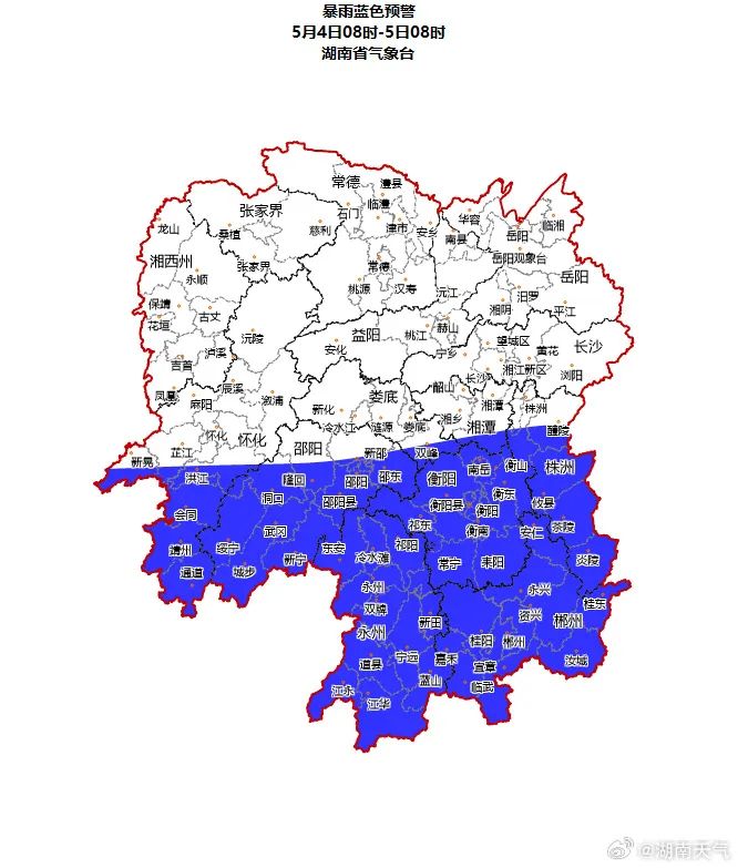 湖南省气象台预计,受冷空气影响,今天(5月4日)至明天白天有一次较强降雨过程,其中今日湘中以南部分地区大到暴雨,局地大暴雨,并伴有雷暴大风等强对流天气。此轮降雨将于5月5日减弱,5月4日为最强时段。