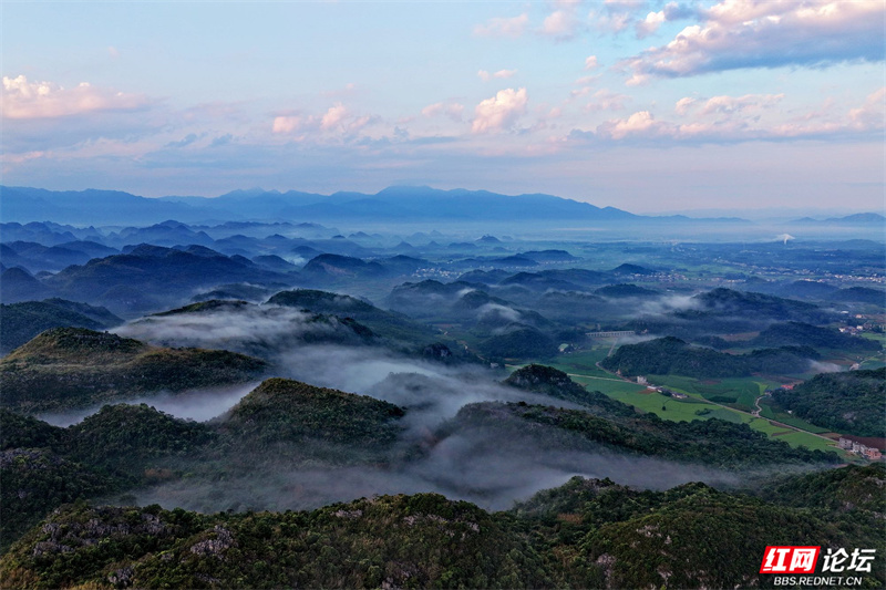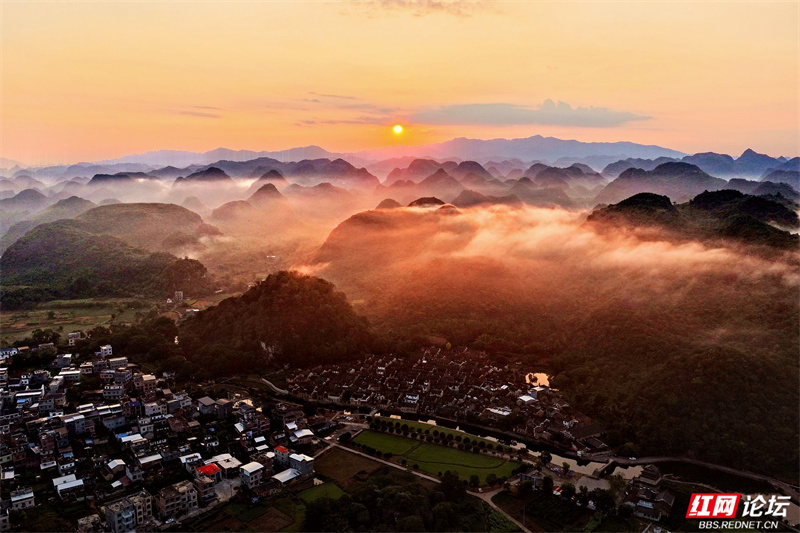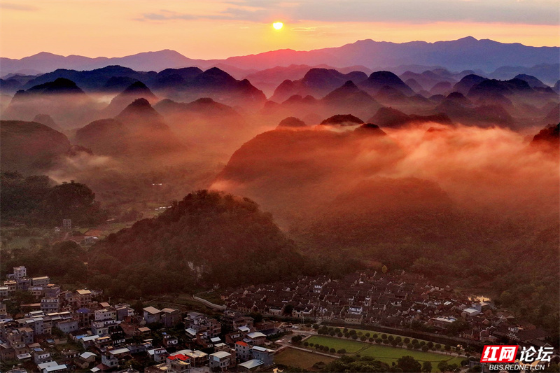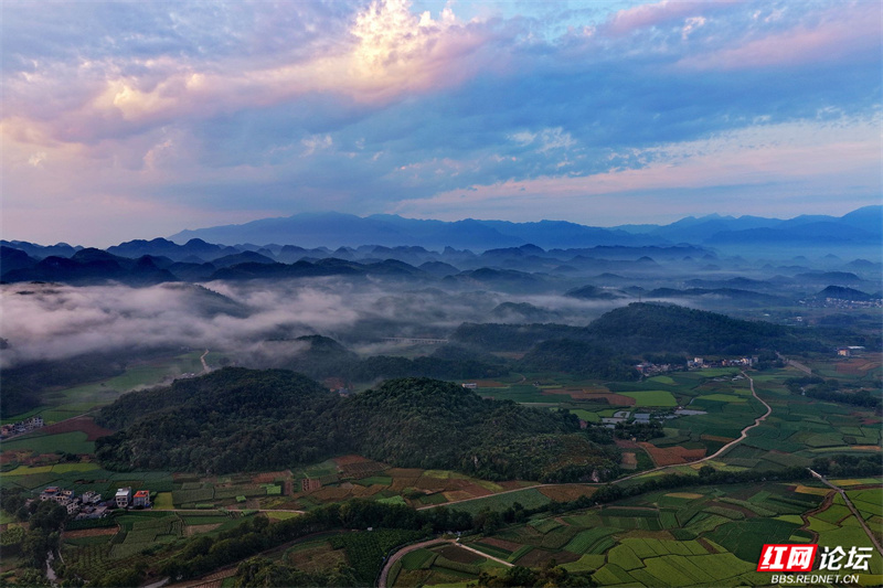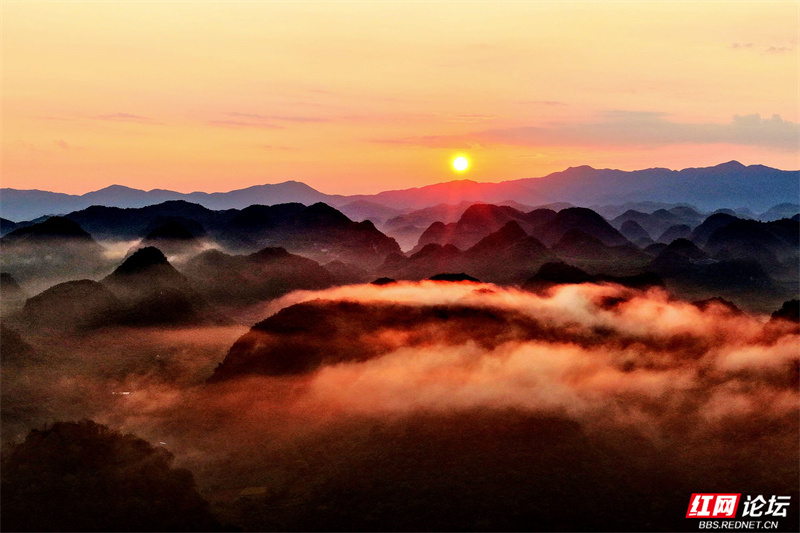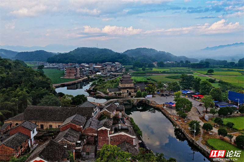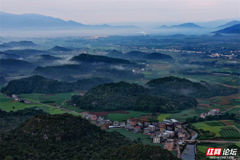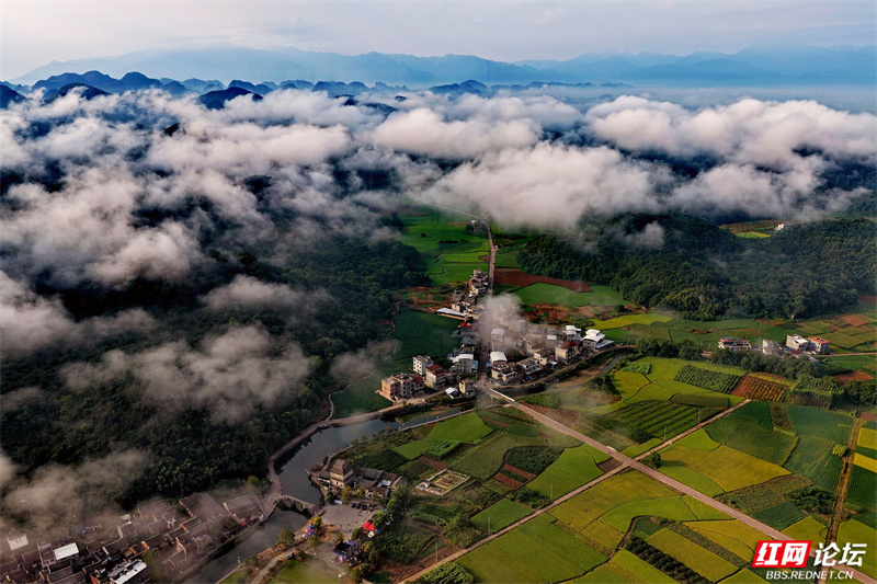 石桥不语,塔影沉静,时间仿佛在此缓行。这是湘南最初的浪漫——朝霞、云海、梯田、村落交织如卷,每一瞬,都是天地落笔的深情。(图文/杨勇)