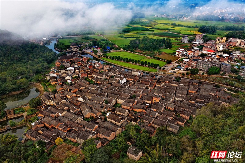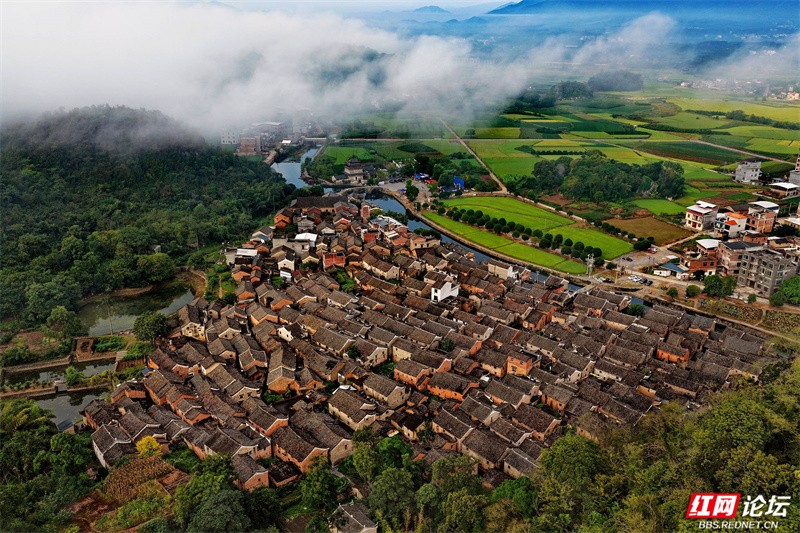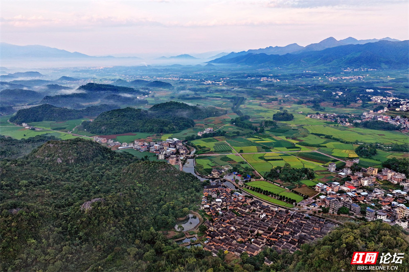 10月8日破晓,江永上甘棠。霞光为云层镶上金边,山峦在薄雾的轻纱中渐醒。晨光缓缓揭开古村的黛瓦白墙,稻田与流水,守护着这片千年人间。