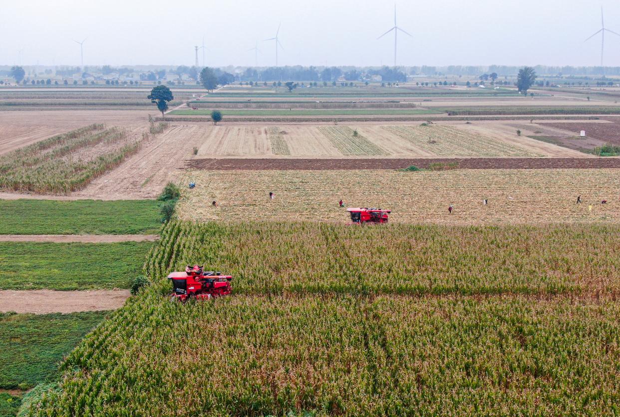 10月14日,在河南省商丘市睢县董店街道曹庄村一处农田内,收割机在抢收玉米。(新华社)