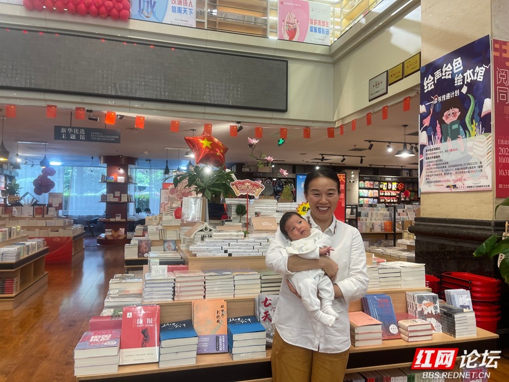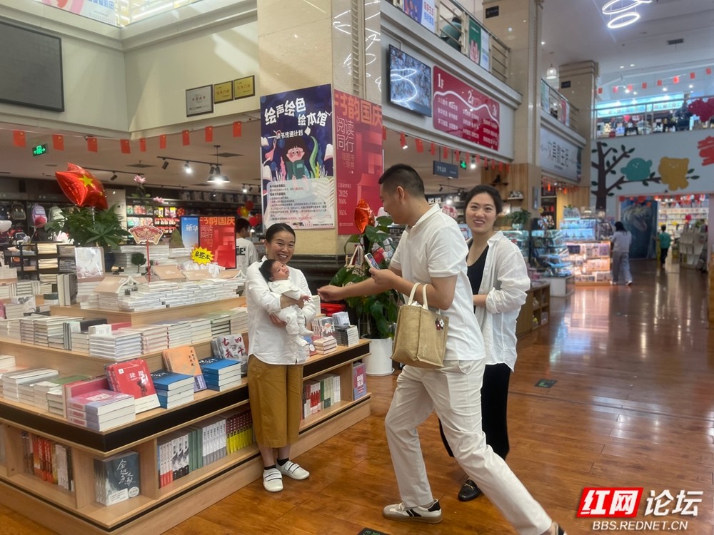 国庆第三天的午后,我闲来无事,来到益阳书城逛一逛。刚走进大厅,就看见温馨的一幕:一位爸爸正举着手机,为奶奶怀里的宝宝拍照。一旁,笑容温柔的妈妈站在旁边。我忍不住走上前,轻声问:“过节怎么想到带宝宝来书城呢?”她眼睛一亮,答道:“今天刚好是他出生第一百天,想带他来闻闻书香。”