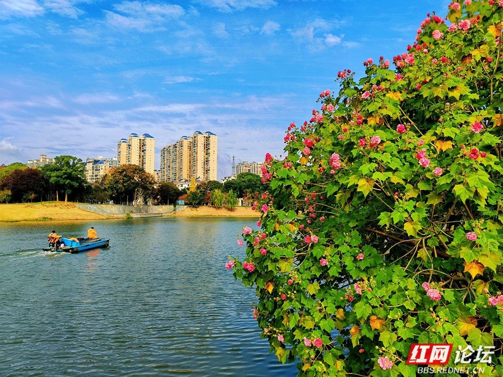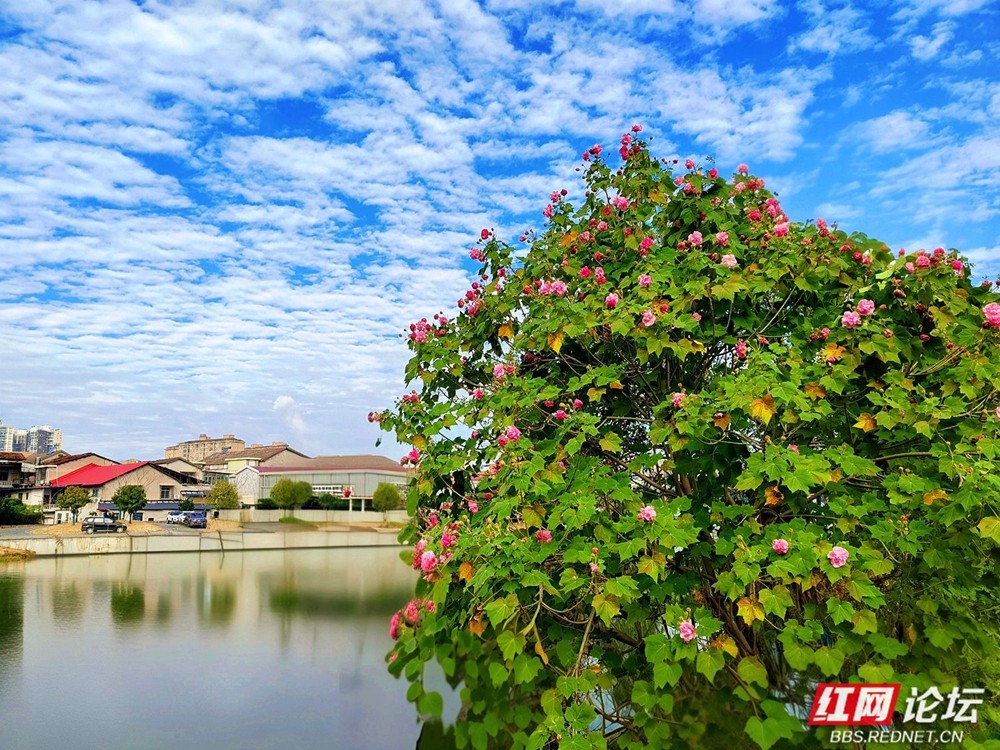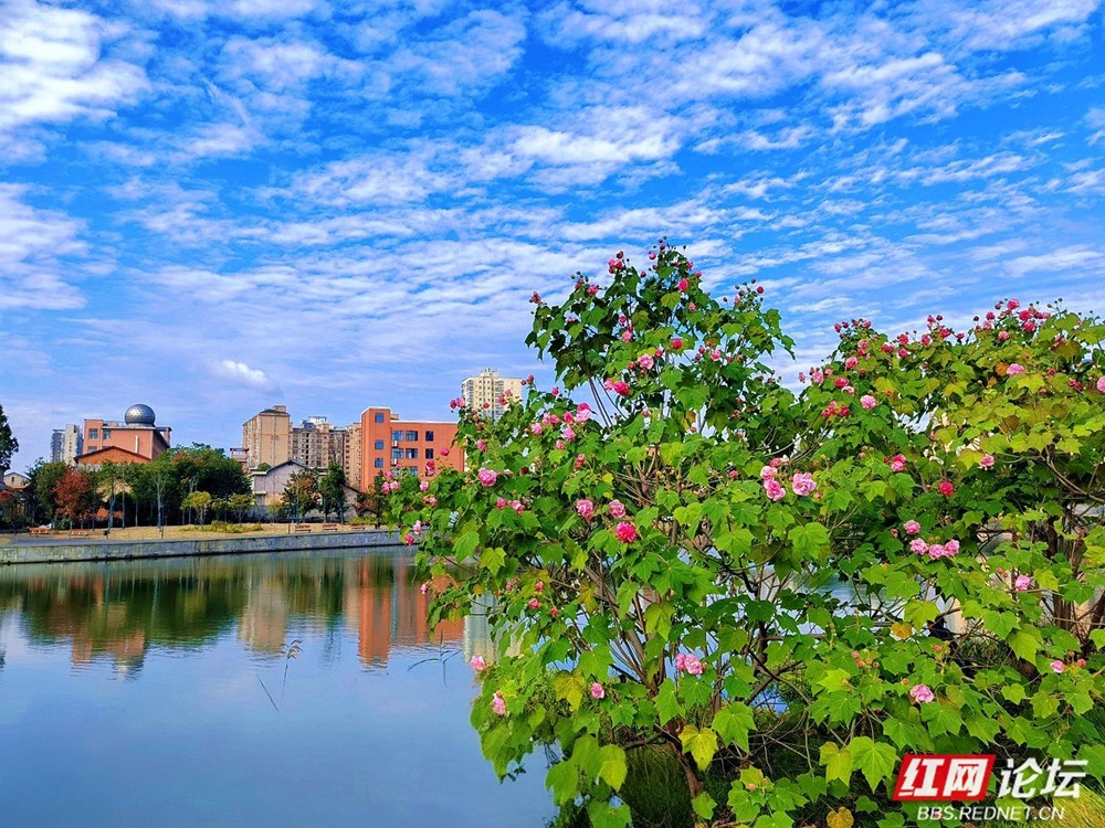 常德一夜入冬,穿紫河畔木芙蓉逆寒绽放。(图源:红网论坛@下官百平)