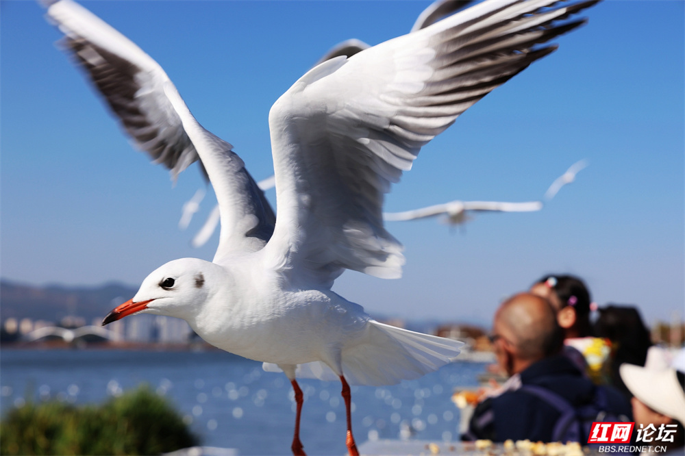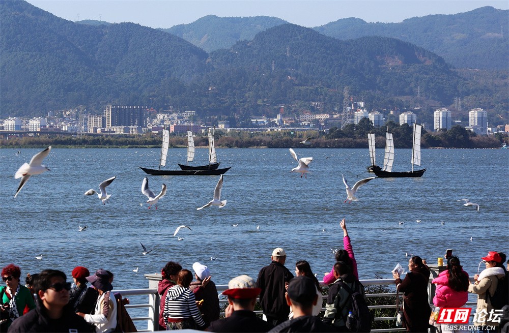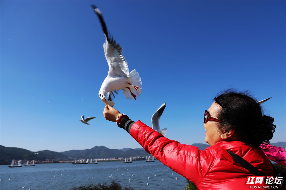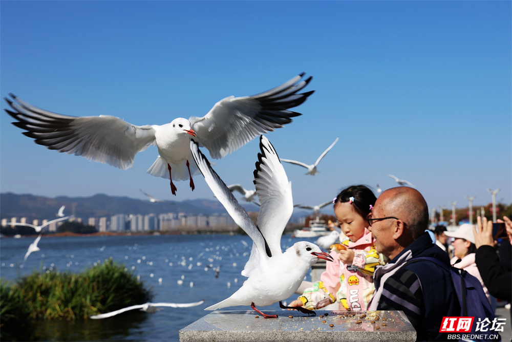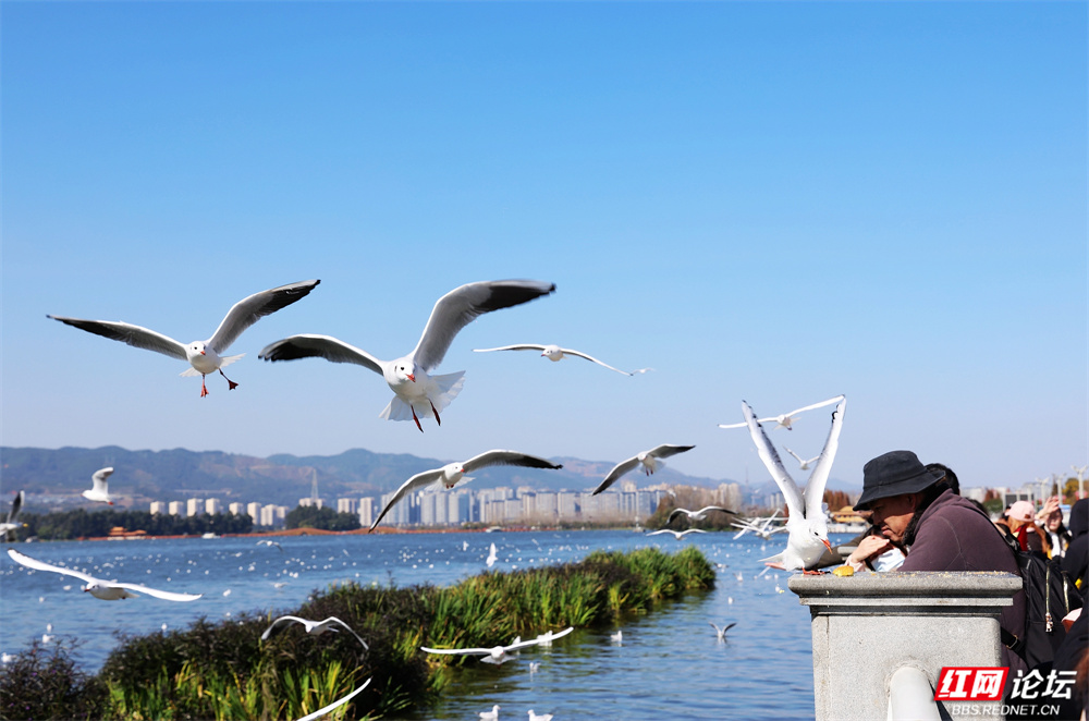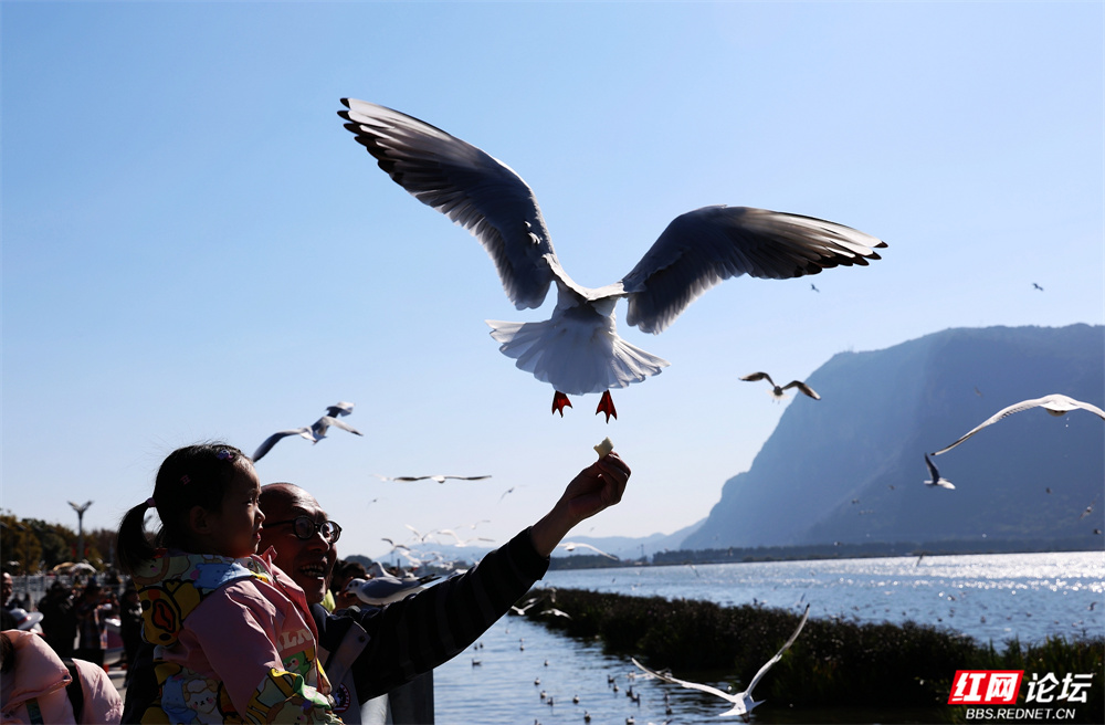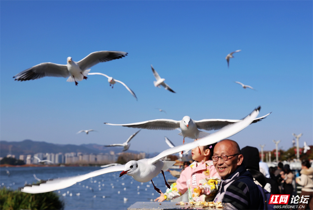碧波荡漾的云南滇池之畔,冬日的暖阳为水面镀上金辉。成群红嘴鸥如雪片般掠过天际,羽翼轻振间,洁白的身影与苍翠山峦、粼粼波光交织成画。游人驻足湖岸,举着面包屑的手引来鸥群盘旋俯冲,孩童仰头惊呼,老者含笑凝望——人与鸥的默契,在此刻化作最温柔的诗行。