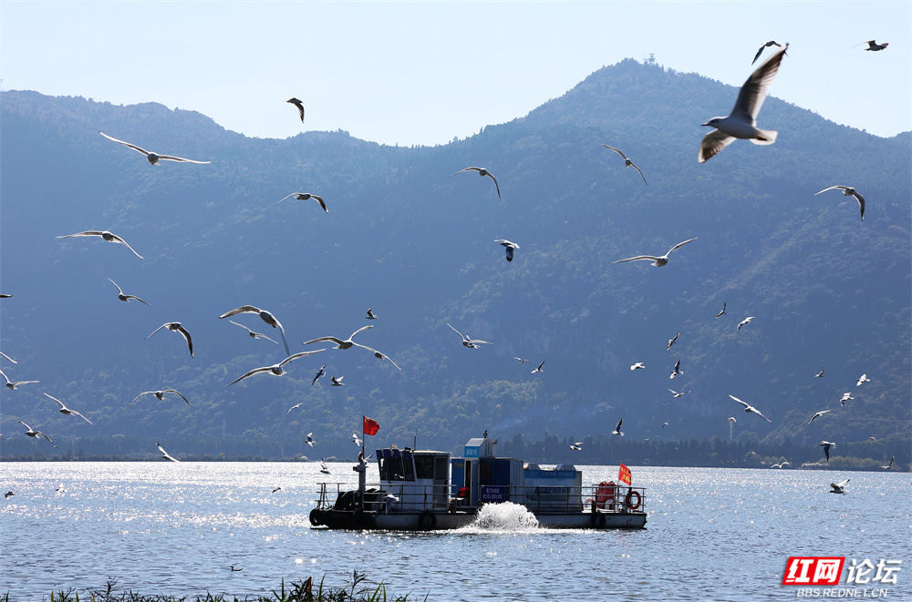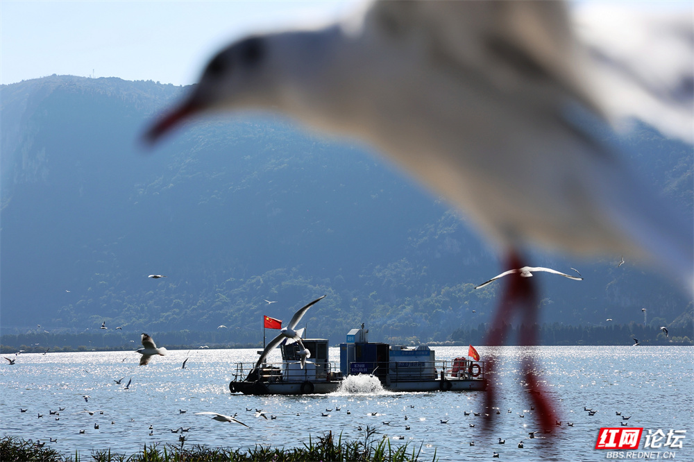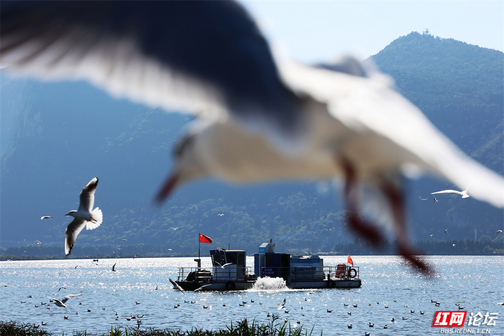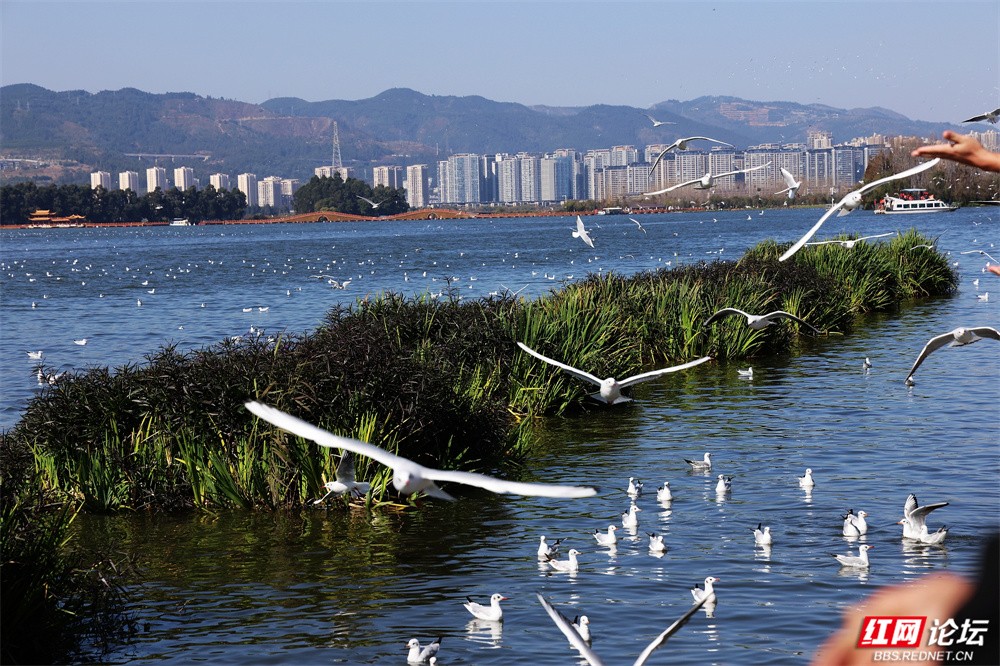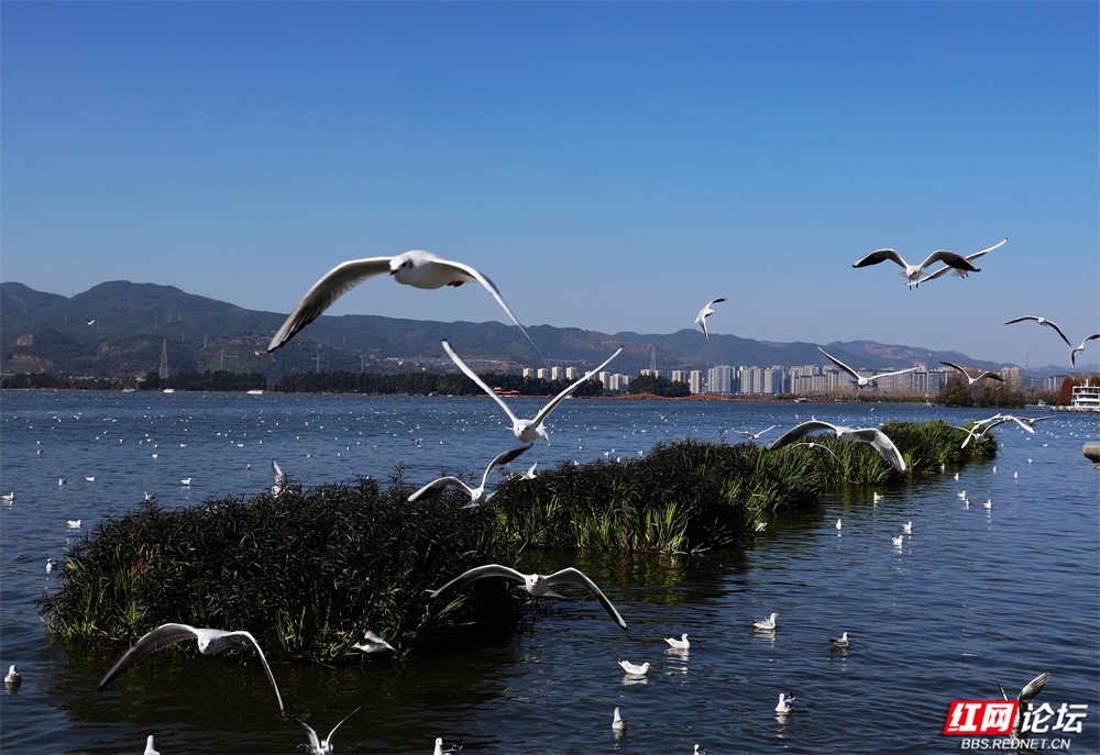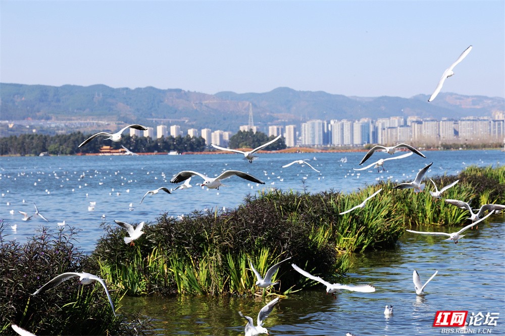 碧波荡漾的云南滇池之畔,冬日的暖阳为水面镀上金辉。成群红嘴鸥如雪片般掠过天际,羽翼轻振间,洁白的身影与苍翠山峦、粼粼波光交织成画。游人驻足湖岸,举着面包屑的手引来鸥群盘旋俯冲,孩童仰头惊呼,老者含笑凝望——人与鸥的默契,在此刻化作最温柔的诗行。