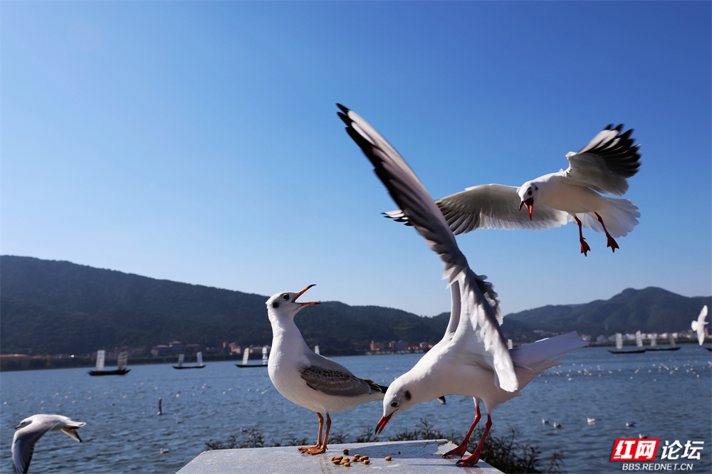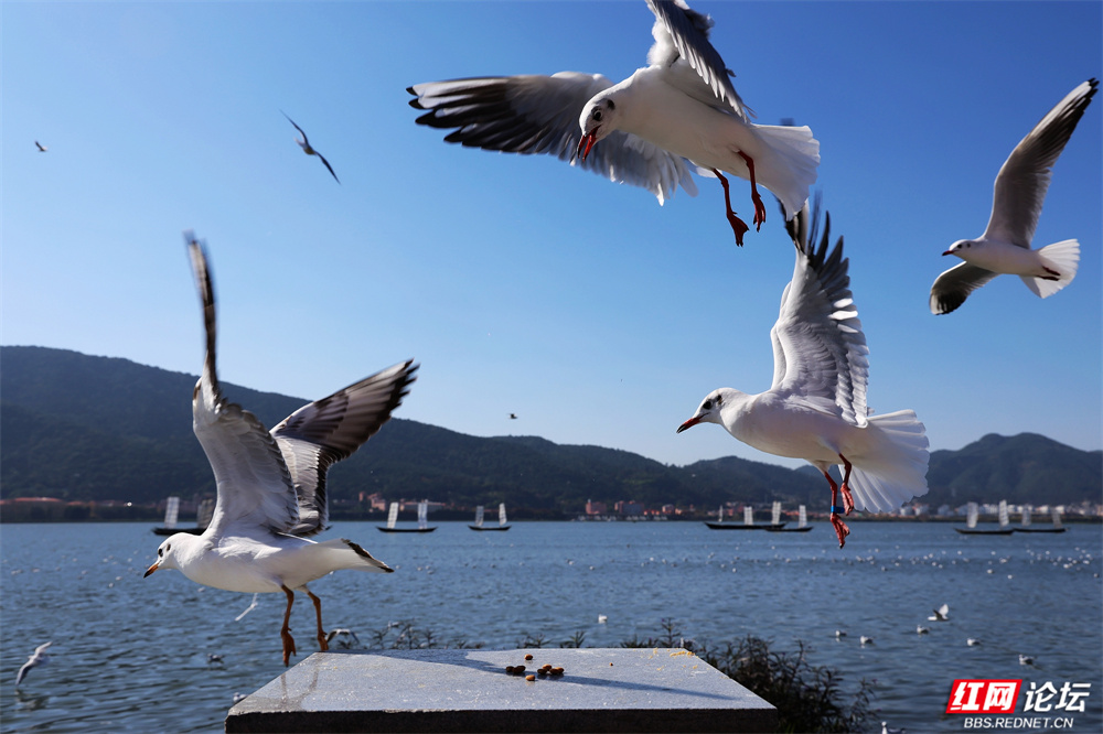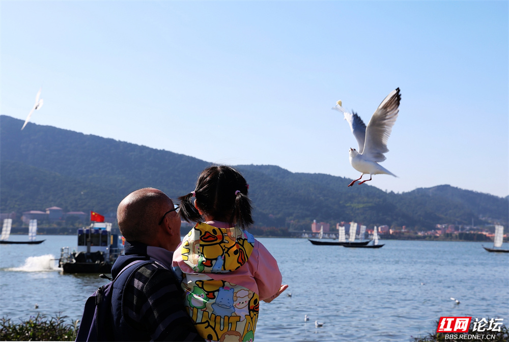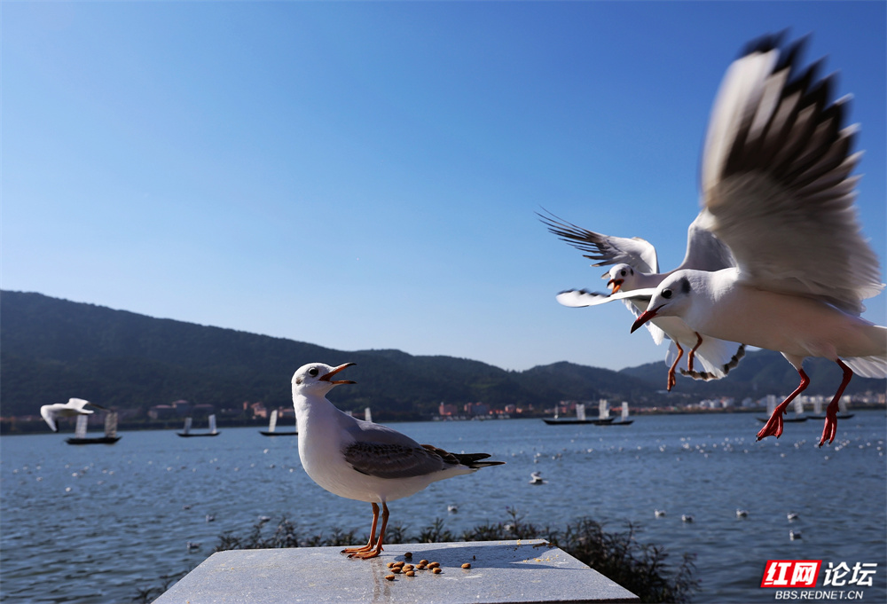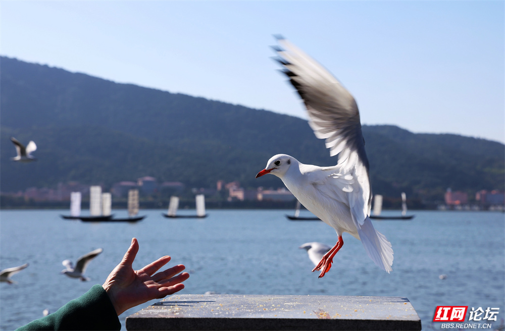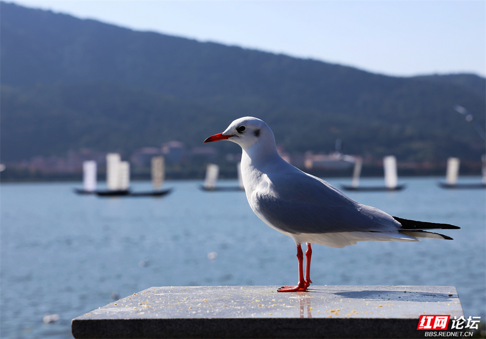 帆影点点泊于湖心,古韵悠长;楼宇参差隐现远山,城野相融。忽见一鸥单足立于石台,红喙微张似歌,身后涟漪轻漾,恍若天地独享的静谧。偶有游船驶过,鸥群如云涌随,翅尖掠过水面,溅起一串银珠,惊起满湖清欢。(图文/彭定湘)