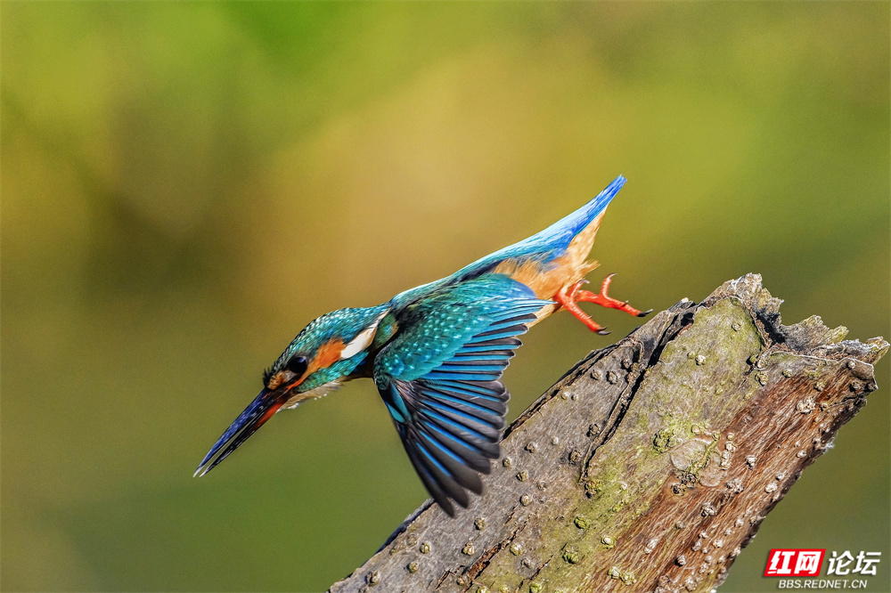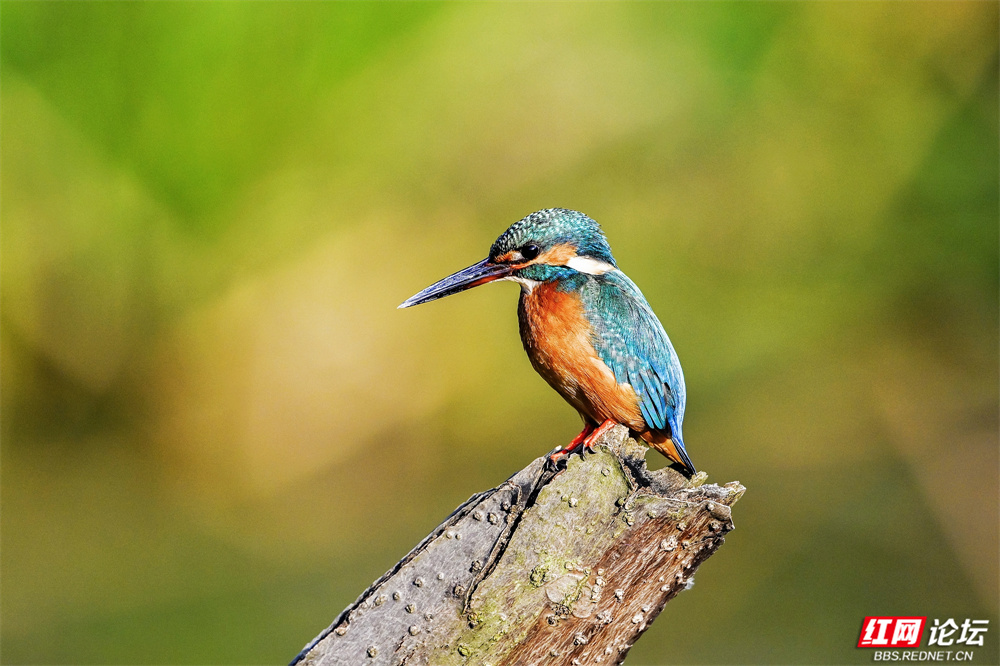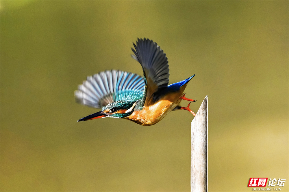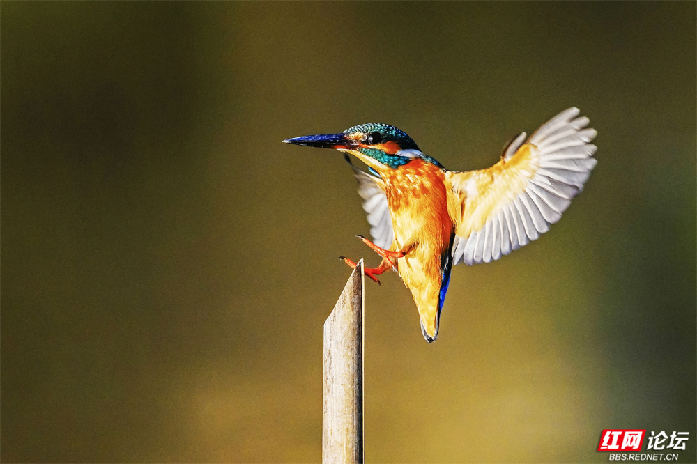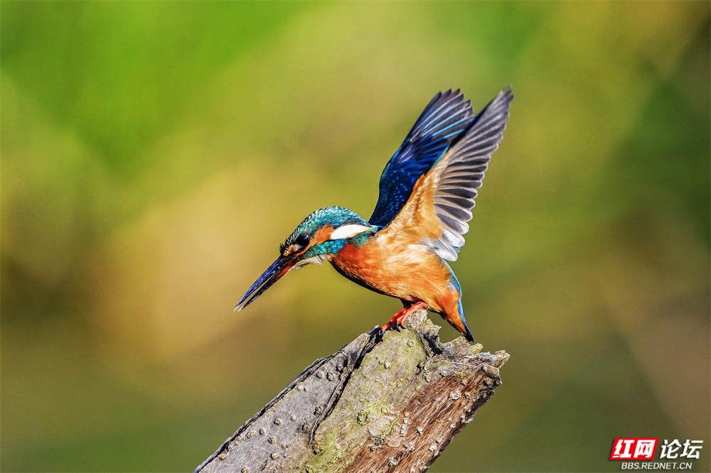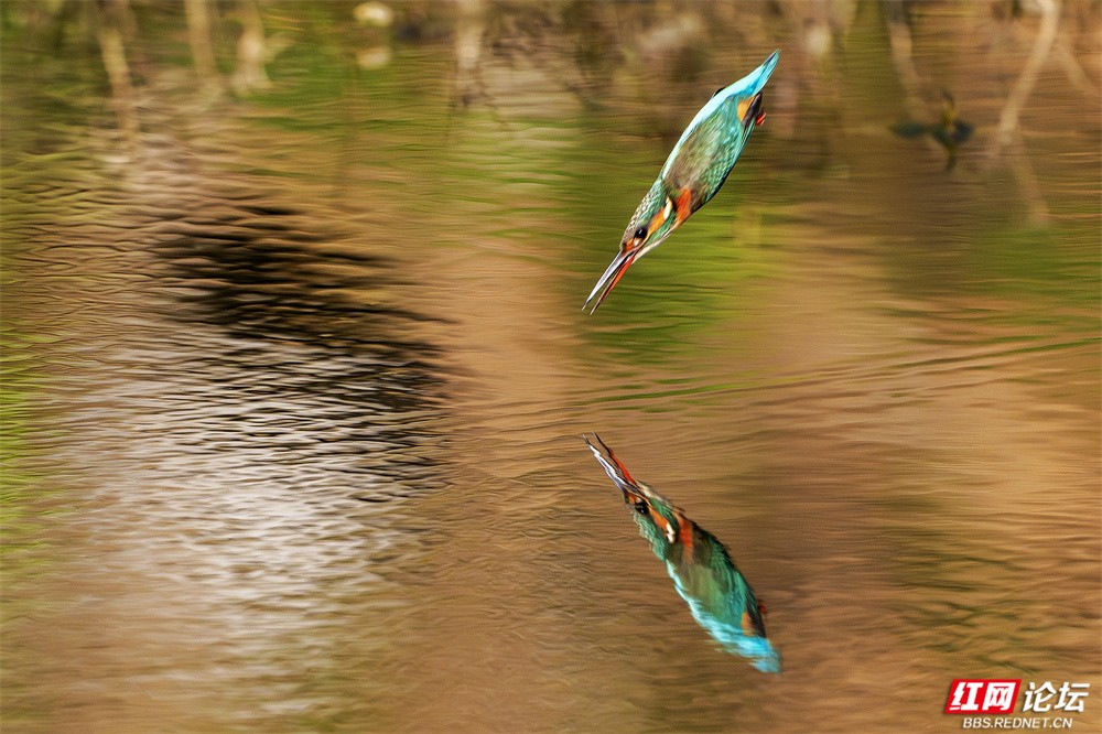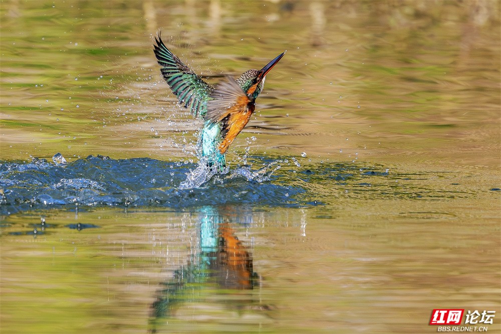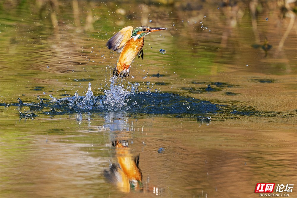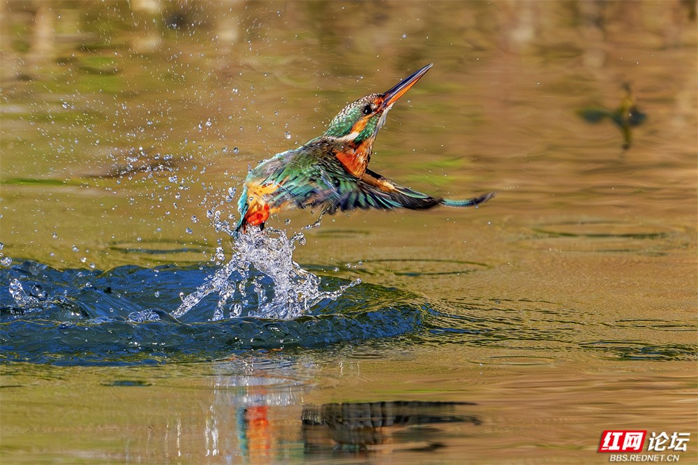 在怀化市鹤城区的湖天小游园,撞见了这抹灵动的“宝石色”——蓝绿裹着暖橙的羽毛,像把春日调色盘揣在了身上。先是蹲在木桩上支棱着长嘴“放空”,下一秒翅膀一振就弹向水面;憋足劲儿扎进水里的瞬间,水花还没来得及散开,它已经叼着收获、扑棱着翅膀窜了起来。