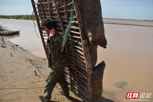 羊皮筏子票价每人40元,羊皮筏子不能随便上、随便坐,要由船夫小哥根据他目测各人体重状况进行合理“配载”。这我理解,配载不合理会翻“船”。船夫小哥一个一个地把大家安排上筏子后,就开“船”了,这是我第一次在黄河上“航行”,心里有些紧张,但更多的是兴奋。
