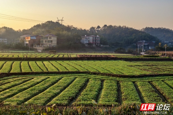 这片田野褪去了九、十月的金黄稻浪,换了崭新模样。农人将土地翻整成规整的土块,条条沟壑相间留作水沟,田垄间尽数栽上油菜。撒播的油菜冒出细碎绿苗,嫩得晃眼;手工栽种的则成行排列,齐整有序,透着别样生机。朝阳从东方斜照而下,给土块镀上柔暖红光,横纵交错如精心勾勒的笔触,似给乡村铺了层温润红毯。光线穿透远山岗峦,在山谷间织就条条红芒,鲜活又明媚。