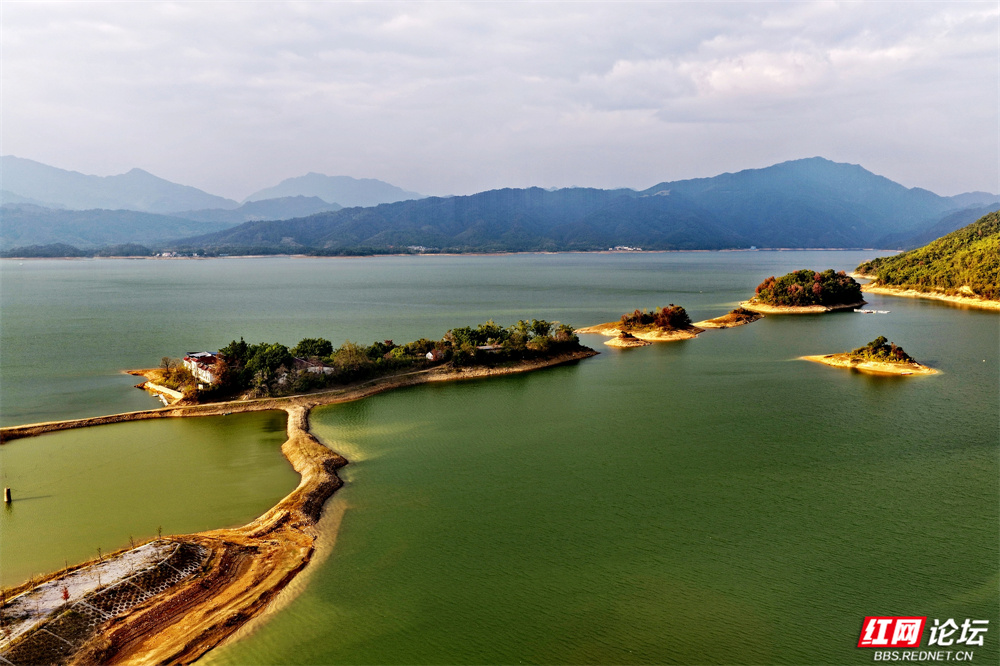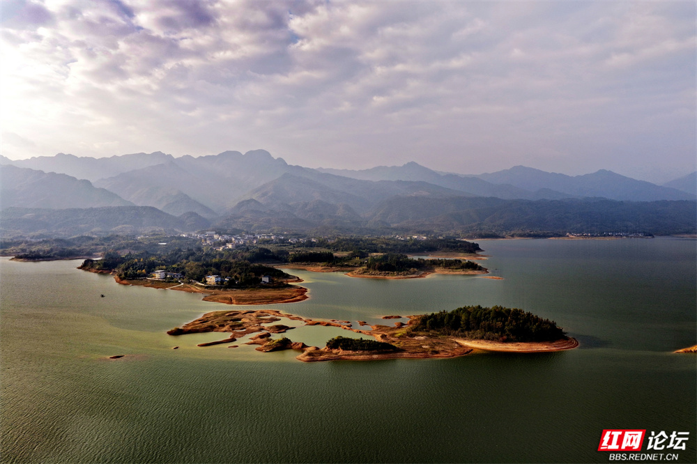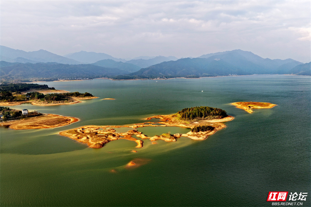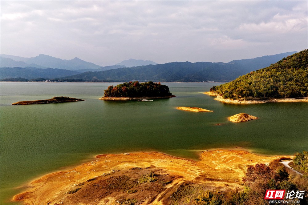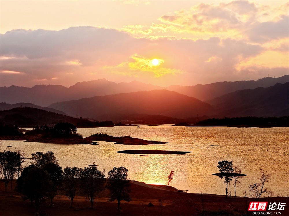 落日熔金,暮云合璧。当最后一缕光斜斜铺过湖面,整片山水便沉入一场橙色的梦境。远山如黛,层叠起伏,在天际勾勒出沉默的轮廓;近水含烟,粼粼波光里,倒映着天空最绚烂的告白。几座小岛静静泊在暖金色的水中央,像散落的翠玉,又像停驻的舟。