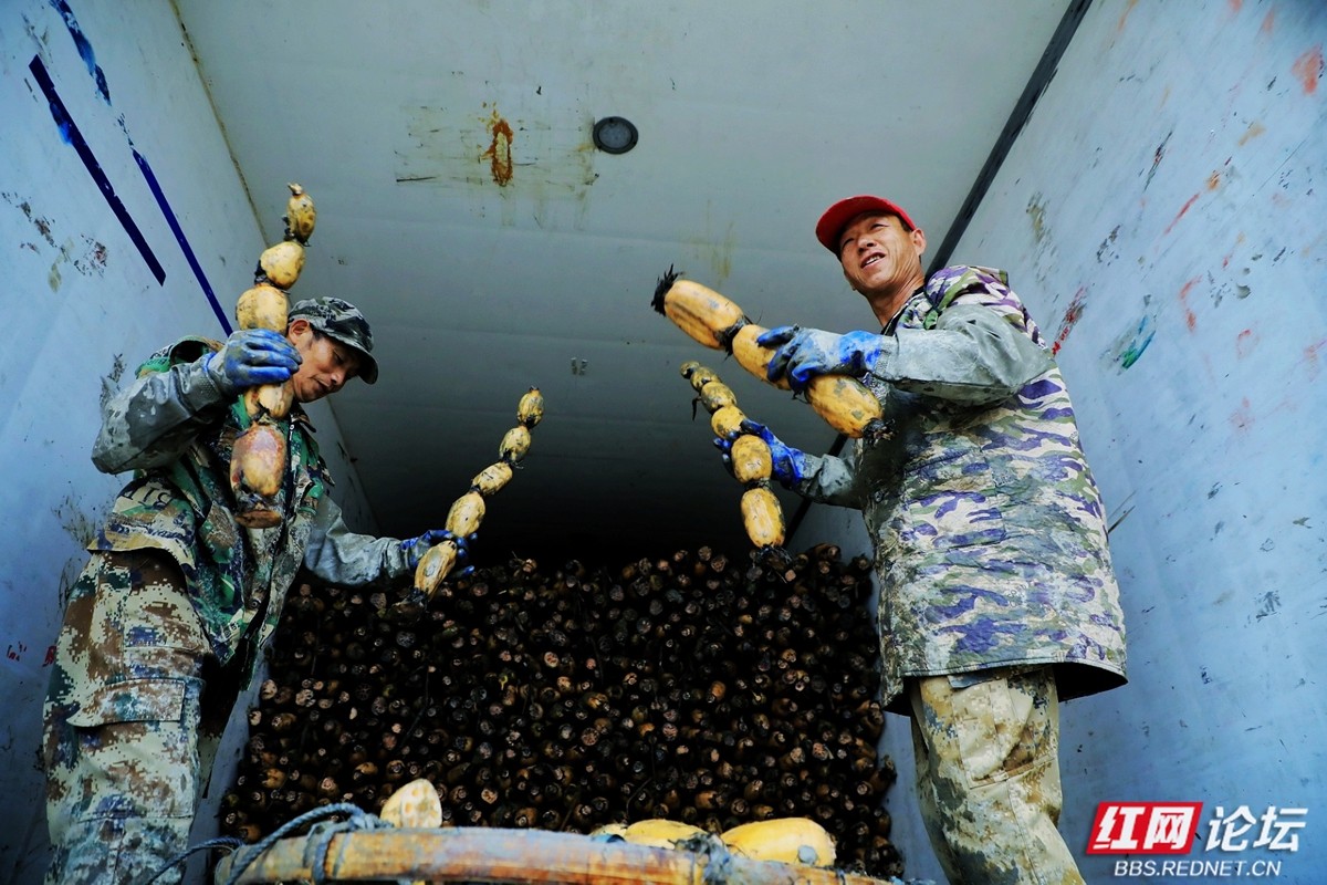 黝黑的手臂溅满泥点,额角的汗珠顺着晒得发亮的脸颊滑落,可眉眼间,却盛满笑意——那是收获的满足,是劳作的荣光。车厢里,两人默契地抛接莲藕,白胖嫩滑的藕段在空中划出流畅的弧线,一层层堆叠,渐渐垒成一座雪白的小山。