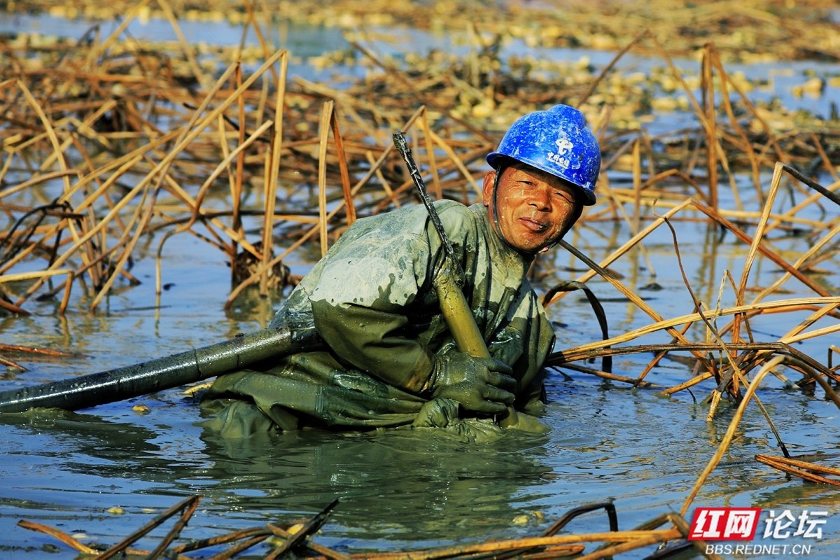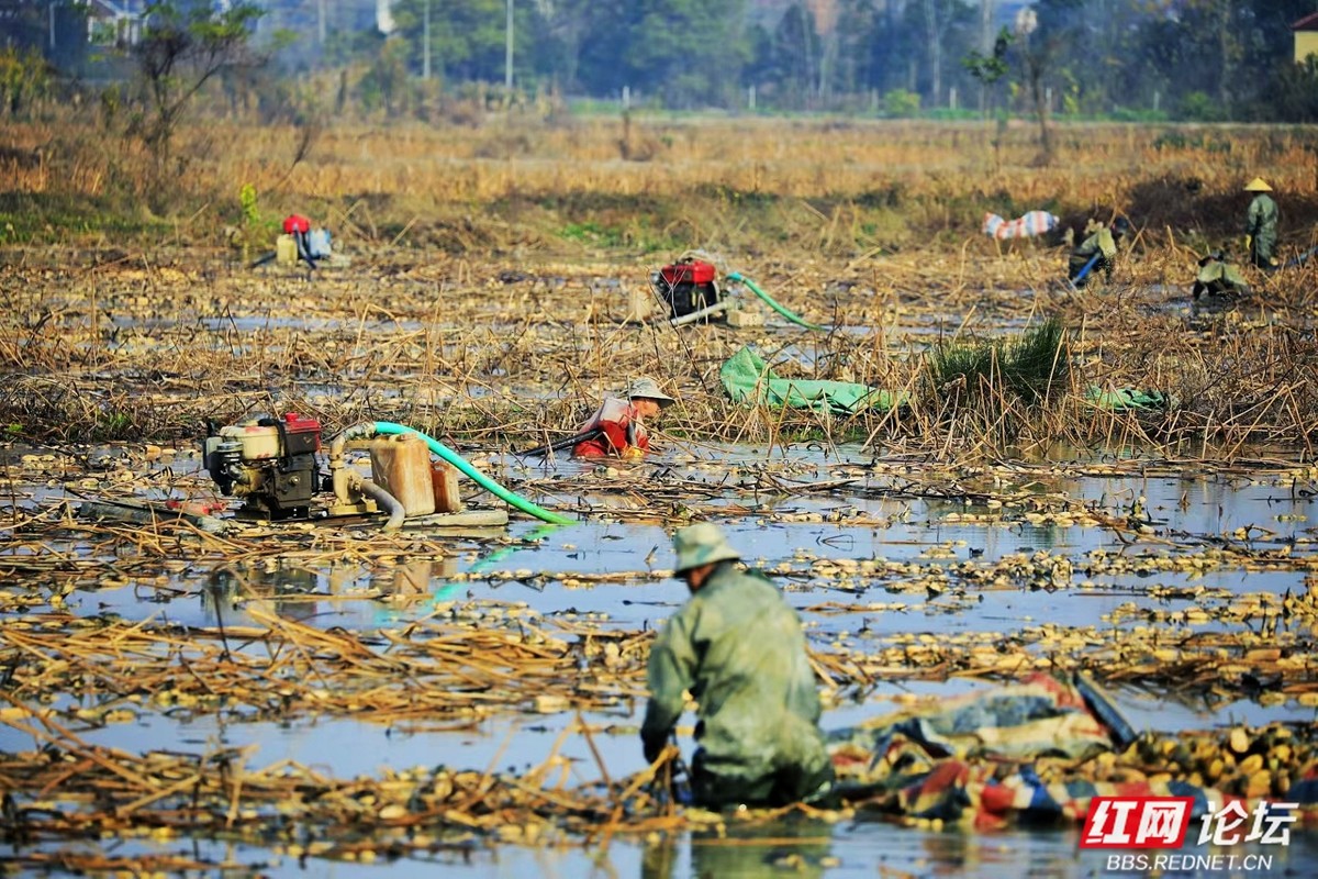 塘边,抽水机“突突”作响,搅动着粼粼水光,也缓缓抽走塘底的淤泥,让深埋的莲藕破泥而出,重见天日。远处,农舍在冬日晨雾中若隐若现,炊烟袅袅,与这片热火朝天的劳作场景遥相呼应。人影、水光、藕香交织成趣,勾勒出屈原农场最温暖、最生动的冬日画卷。