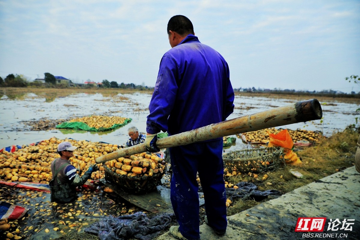 寒凉的泥水漫过膝盖,采藕人裹着厚重的防水衣,在淤泥中躬身前行,双手在水下精准摸索。随着一声轻响,粗壮的莲藕被连根拔起,裹着黑泥,带着泥土的清甜,利落地滚入竹筐。扁担在肩上压出低沉的吱呀声,他们在湿滑的田埂上来回穿梭,一趟又一趟,将沉甸甸的收获送往停靠在塘边的货车。