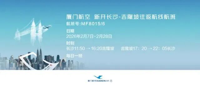 长沙至吉隆坡往返航线航班号为MF8015/6,也将于2026年2月7日至2月28日每日执飞。航班将于11:50出发,16:20抵达吉隆坡;返程航班17:20起飞,22:05抵达长沙,进一步畅通湖南与马来西亚的空中联络。