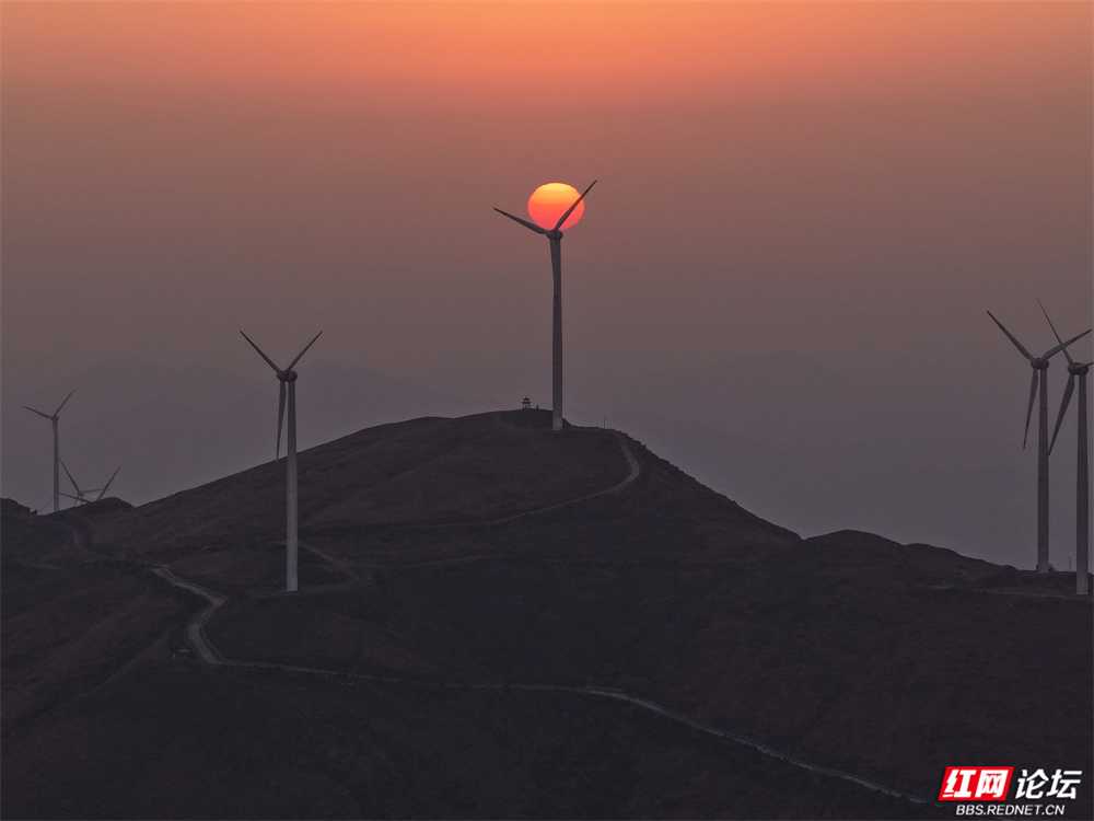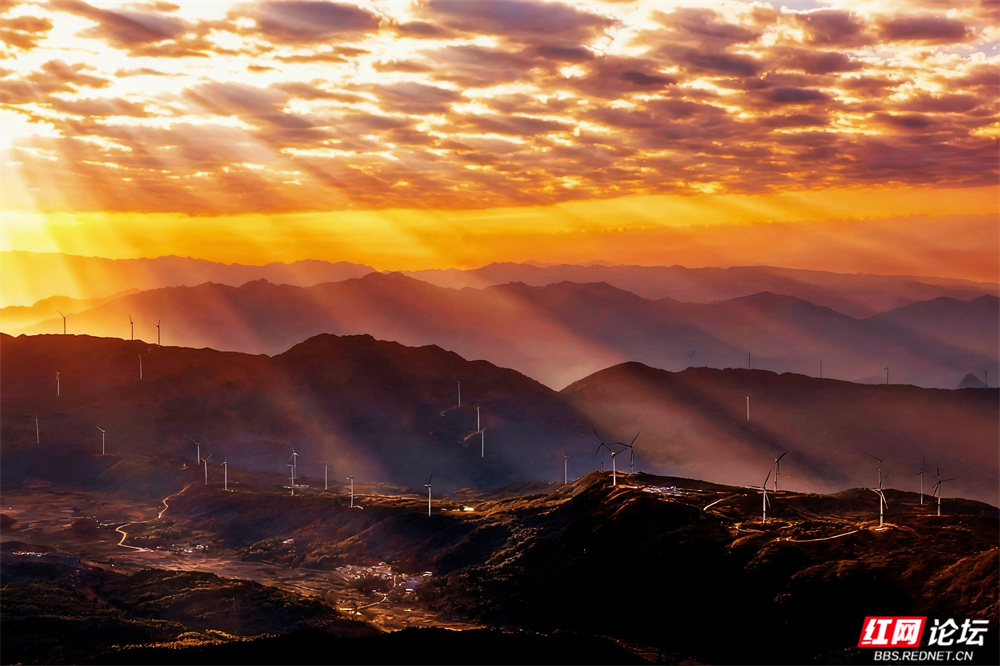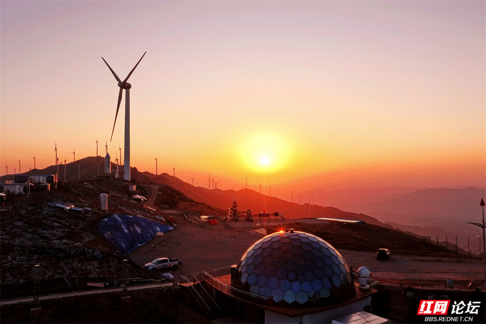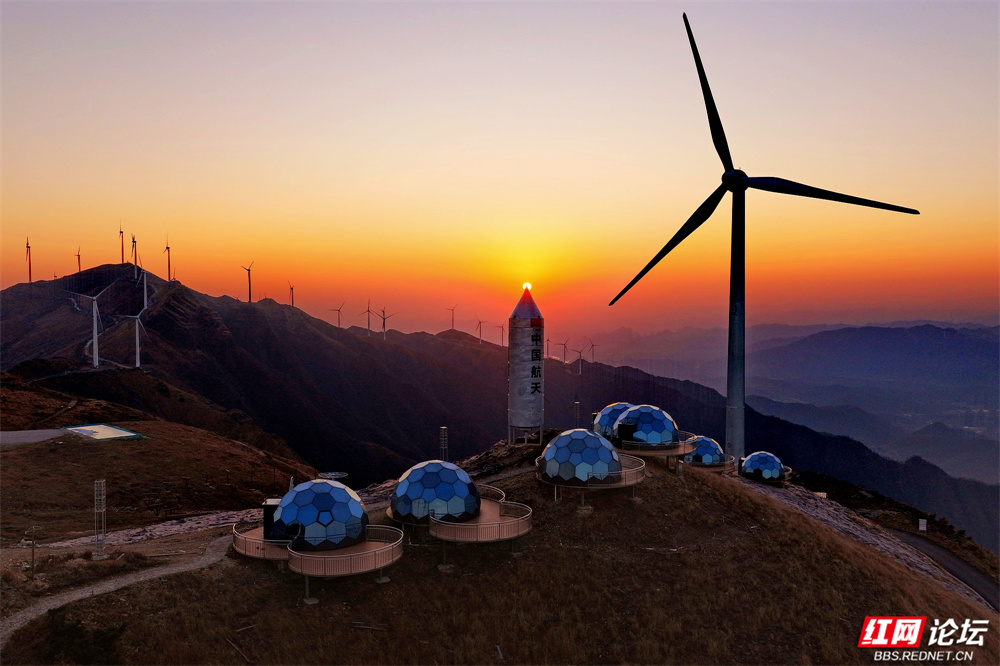 橘色日出从山尖漫开,裹着云海、缠着蜿蜒山路,连太空城的球形小屋与“中国航天”装置,都沾了几分晨辉的温柔。风一吹,风车转,自然的浪漫和科幻的绮梦揉在一块儿 —— 这哪里是追日出,分明是闯进了云间的 “星球秘境”。(图文/杨勇)
