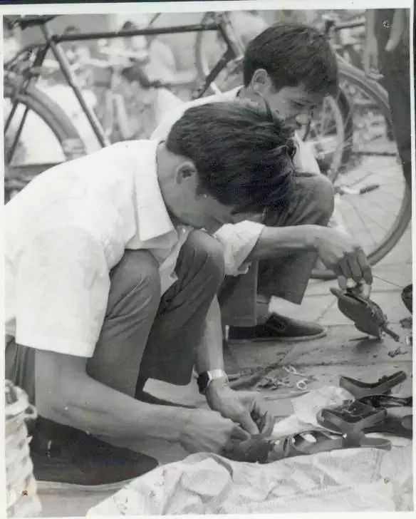 在通用机械厂服务点,一个小伙子(右)正用工具为居民磨着刀具。小伙子身旁放着一副拐杖,他叫力明,是柳州机车车辆有限公司的一名职工。